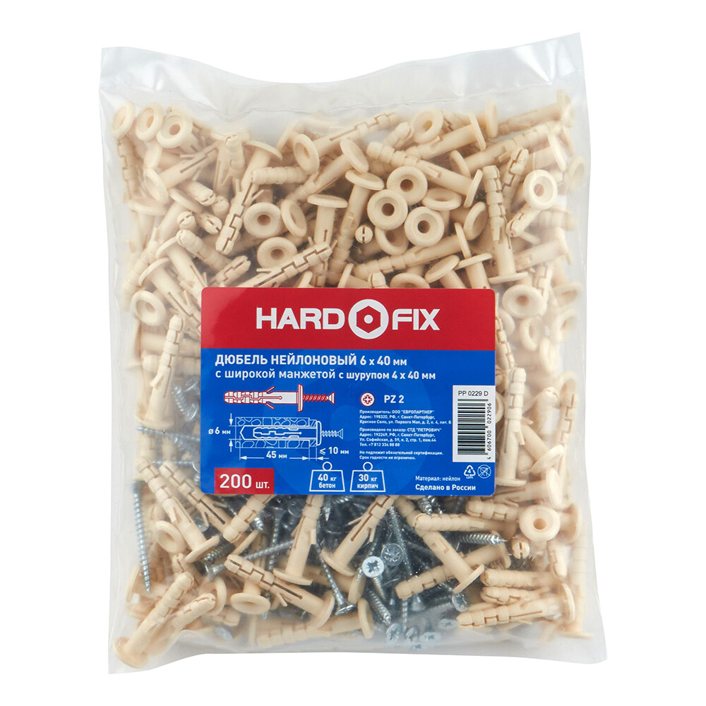 Дюбель распорный Hard-Fix 6×40 мм нейлон с шурупом широкий фланец (200 шт.)