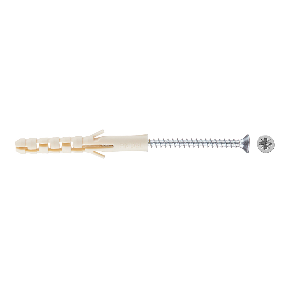Распорный нейлоновый дюбель с удлиненной распорной зоной предназначен для крепления предметов домашнего интерьера, коммуникаций, легких и средних конструкций в бетоне, кирпиче, природном камне, а также может применяться для крепления в пустотелом кирпиче, пористых основаниях: вспененный бетон, керамзитобетон. Дюбель рекомендуется использовать с универсальным шурупом. В комплекте универсальные шурупы с потайной головой 4х60 мм.