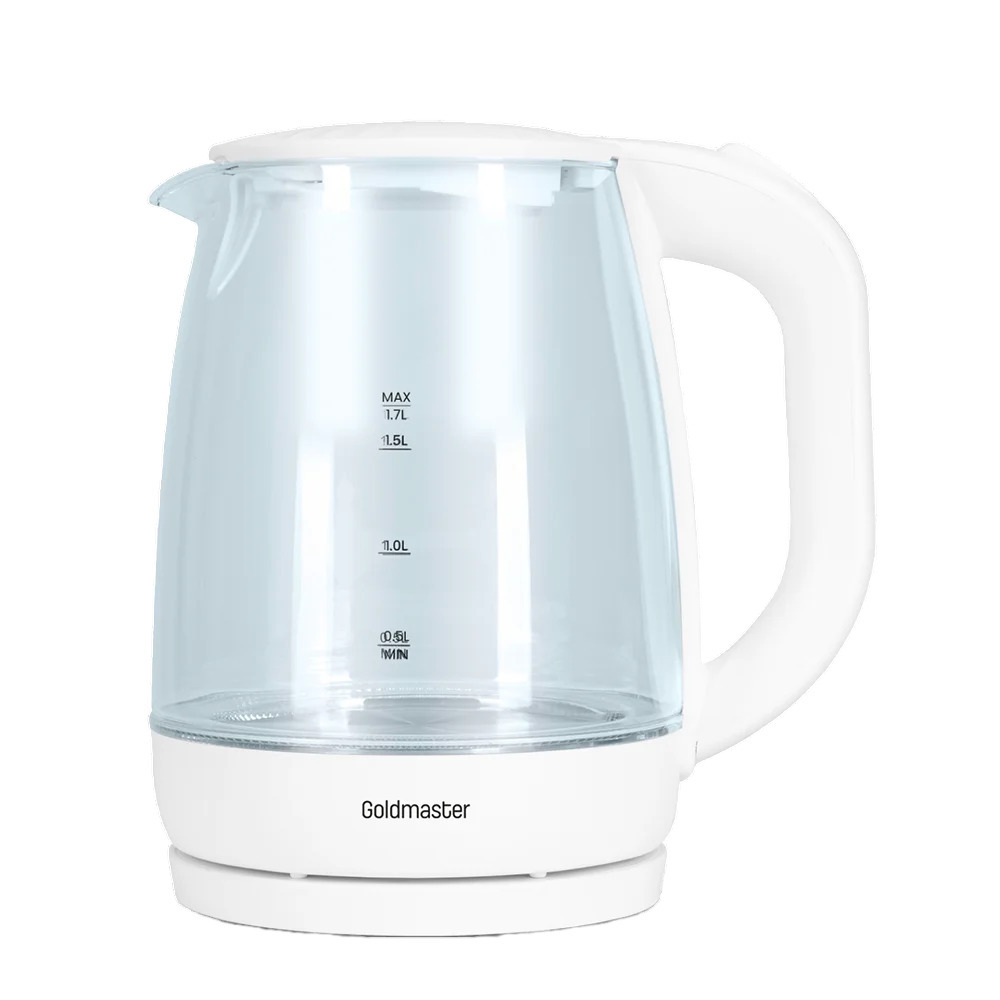 Стильный чайник с корпусом из стекла и белоснежного пластика. Высокая мощность 2200 Вт для быстрого кипячения и емкость 1,7 литра. Автоматическое отключение, система защиты от сухого кипячения и скрытый нагревательный элемент. Поворотное основание на 360 градусов обеспечивает удобную эксплуатацию. У чайника синяя подсветка корпуса и съемный фильтр от накипи.