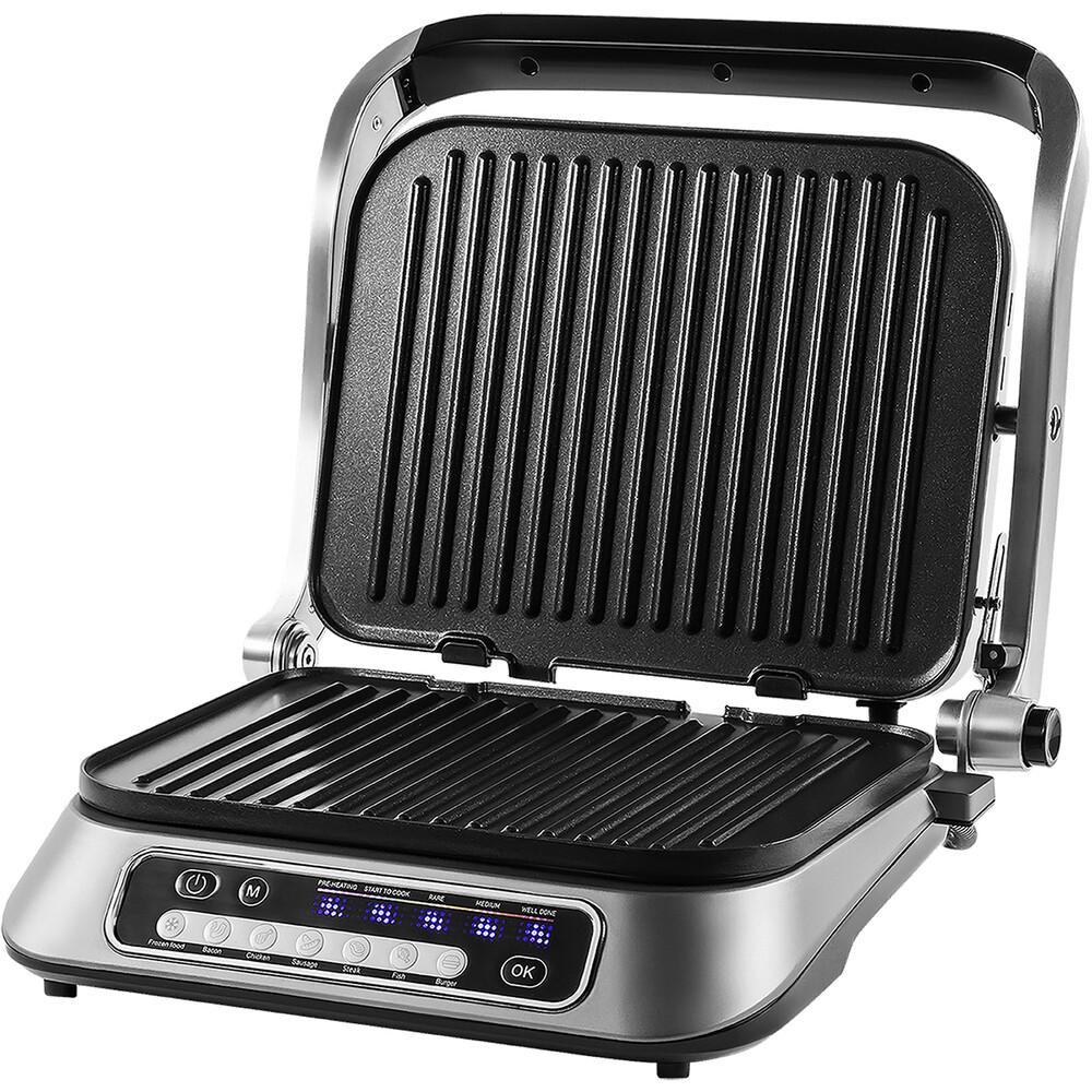 На панели управления есть индикация степени прожарки. Когда мясо дойдет до состояния rare, medium или well done, под соответствующим названием загорится синим. Это помогает определить готовность стейка, не открывая крышку гриля, и вовремя выключить устройство.