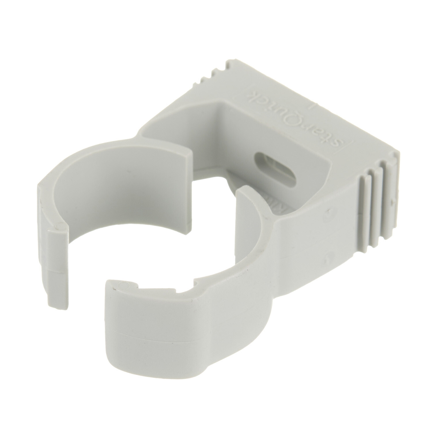 Хомут закрывается при нажатии на трубу, запатентованные боковые ребра позволяют монтировать два и более хомутов друг с другом до DN25.