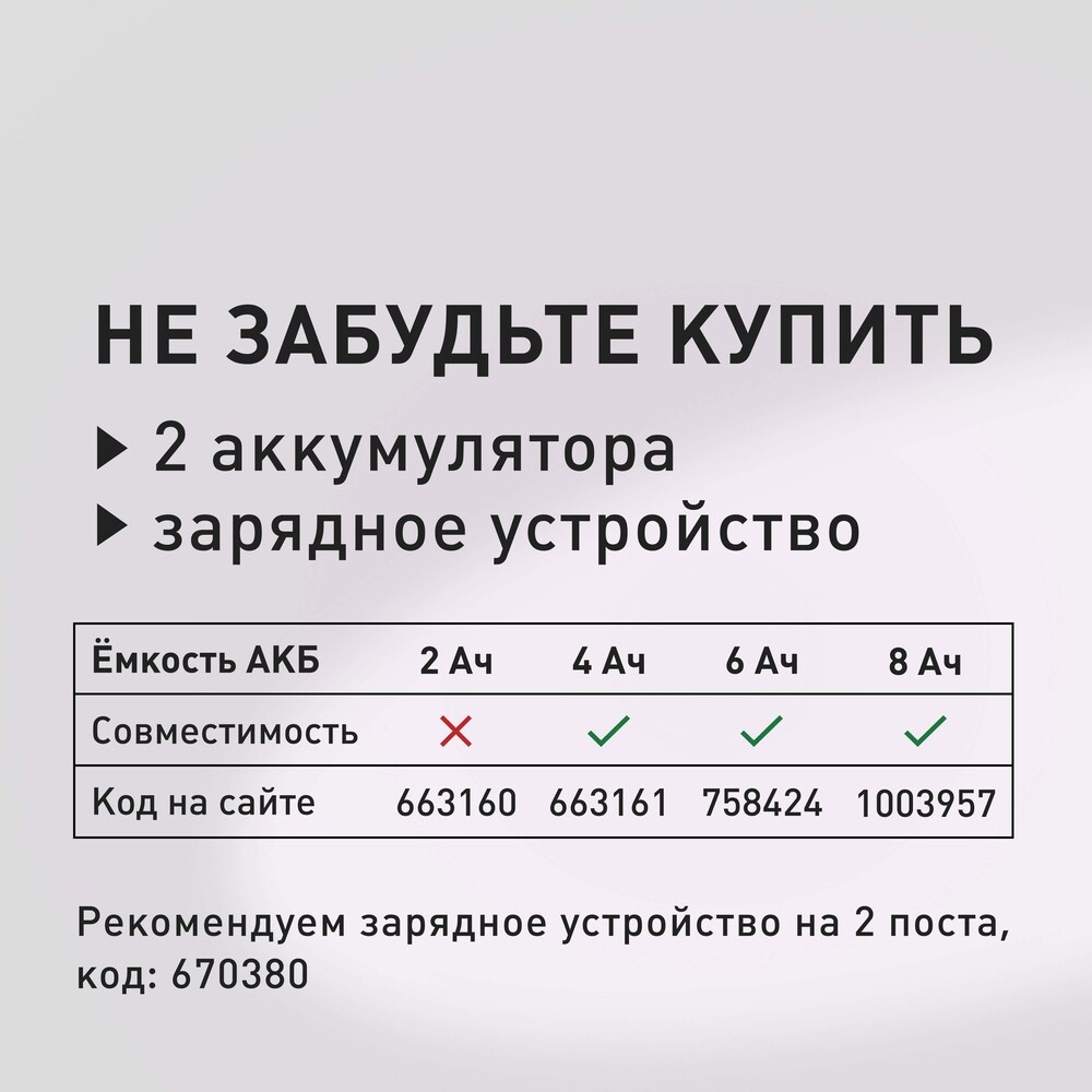 Данная газонокосилка работает от двух аккумуляторных батарей емкостью не менее 4Ач. Зарядное устройство и аккумуляторные батареи в комплект не входят.