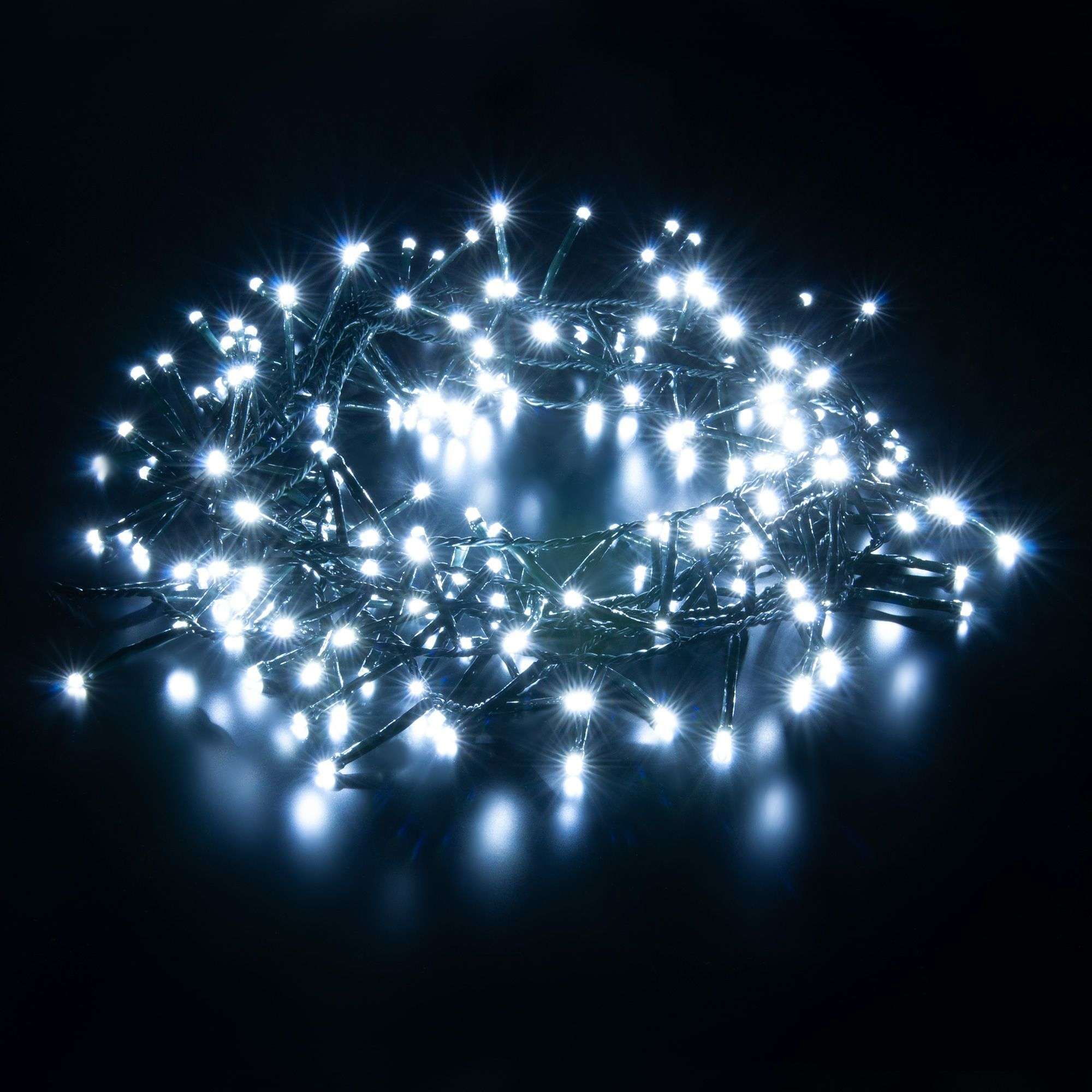 Гирлянда-нить Мишура белый 5м IP20 400-004. Новогодняя гирлянда-нить современного дизайна с миниатюрными лампочками в белых оттенков. Провод темно-зеленого цвета. Такая гирлянда отлично смотрится на ёлке, создавая эффект припорошенного снегопадом праздничного дерева. Складывается впечатление, что дом или общественное пространство украшены светящейся мишурой, так как многочисленные светодиоды расположены на кончиках тонких проводов. Свет получается объёмным и пушистым. Для высокой яркости этой гирлянде не пожалели светодиодов — их здесь 190 штук! Общая длина красивой и практичной гирлянды — 5 метра. Создавать уникальную праздничную атмосферу можно с помощью 8 разных режимов.