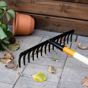 Универсальные грабли с деревянным черенком Plantic Terra с 12 зубцами подходят для рыхления, аэрации и выравнивания почвы.