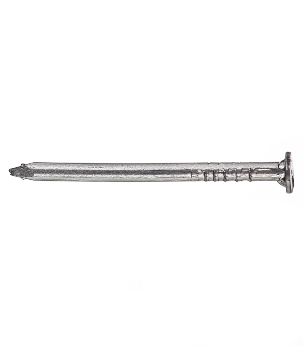 Гвоздь представляет собой длинный и прямой стержень с небольшими неровностями рядом со шляпкой, что улучшает качество соединения.
