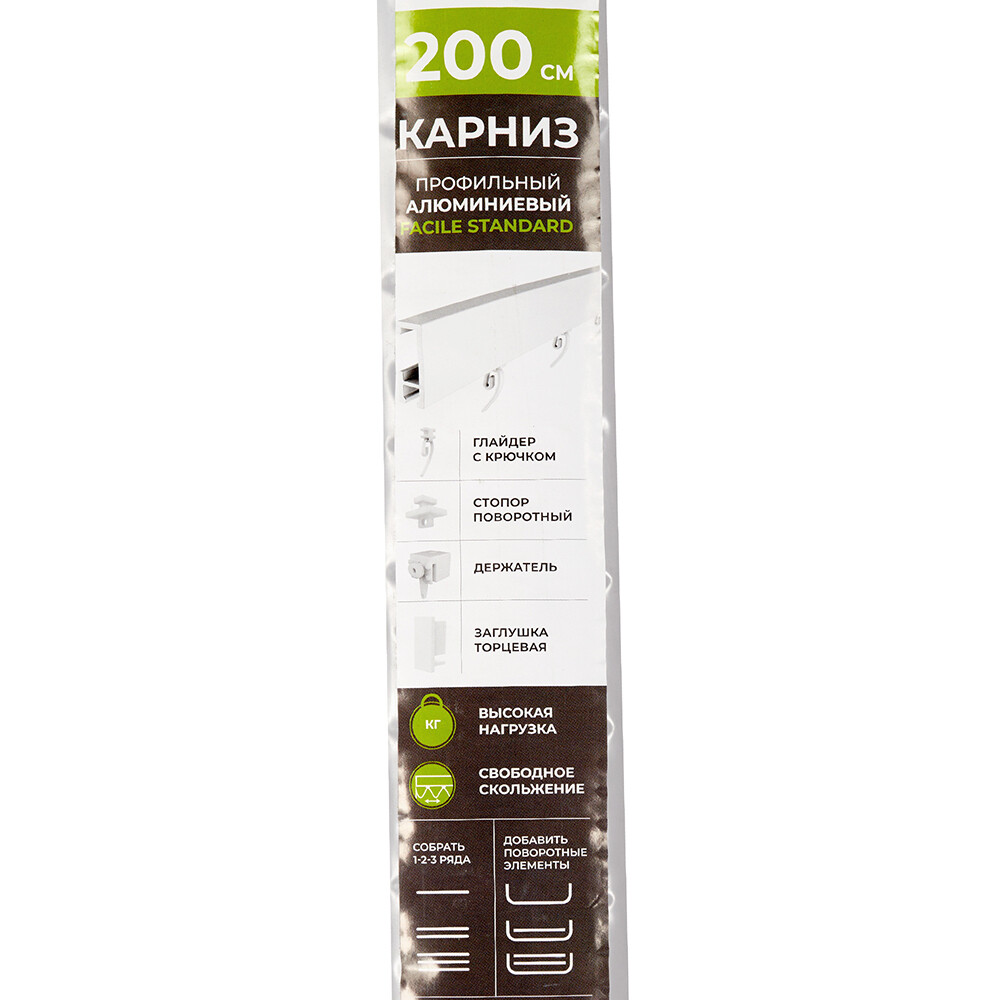 Карниз профильный металлический FACILE – это современный карниз с возможностями конструктора, позволяющий создавать любое количество рядов, длину и геометрию карниза. Решение, не требующее индивидуального изготовления, длительного ожидания и высоких затрат. В комплект входит профиль с уже закрепленными на него держателями и декоративными торцевыми заглушками, набор глайдеров с крючками, обеспечивающими легкий бесшумный ход штор.