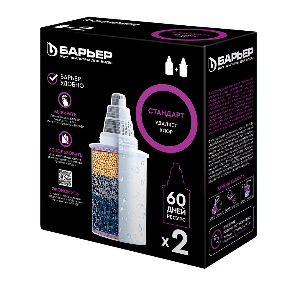 Комплект из 2 сменных кассет для фильтра Барьер Стандарт. Очищает воду от хлора и его продуктов, тяжелых металлов и других вредных примесей. Удаляет посторонние привкусы и запахи. Ресурс каждой кассеты — 350 литров.