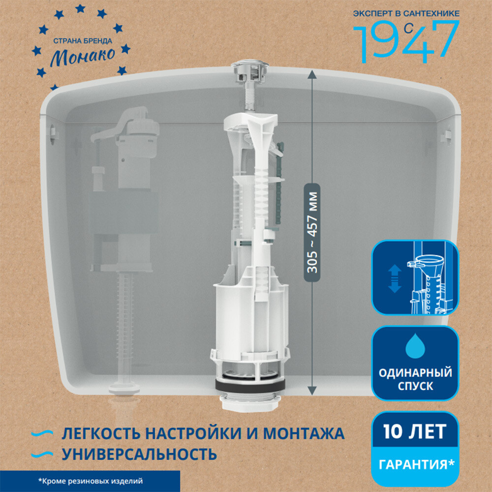 Однорежимный спускной клапан с телескопической трубкой перелива, которая регулируется без подрезки. Хромированная кнопка устойчива к истиранию, выполнена из прочного АБС-пластика, покрытие кнопки выполнено методом гальванизации. Комфортное усилие срабатывания (ниже 20 Н). Подходит для бачков различной высоты (от 305 до 457 мм) под диаметр в крышке бачка от 18 до 42 мм. Прокладка между бачком и унитазом выполнена из пенорезины, хорошо компенсирует неровности полки унитаза. Подходит для установки в бачки брендов Cersanit, Roca, Vitra, YD и др. Продукция изготовлена в соответствии с ГОСТ 21485-2016.