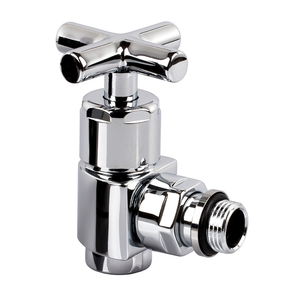Вентиль на подачу SR Rubinetterie угловой серия «Prestige & Minimal», ручной регулировки, преобразуемый в термостатический, с механизмом предварительной настройки, соединение для железной трубы, хвостовик с герметичной прокладкой.