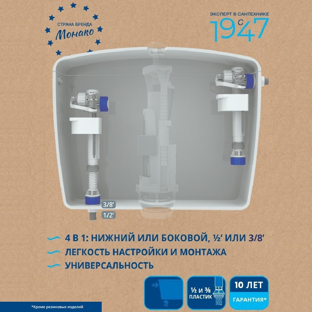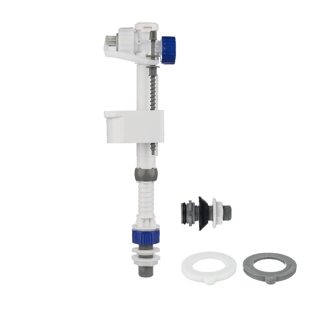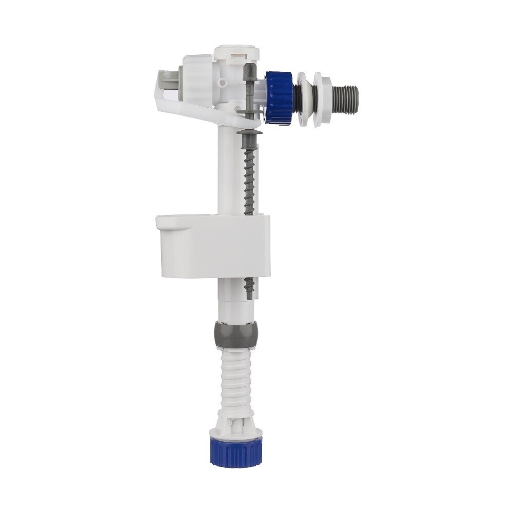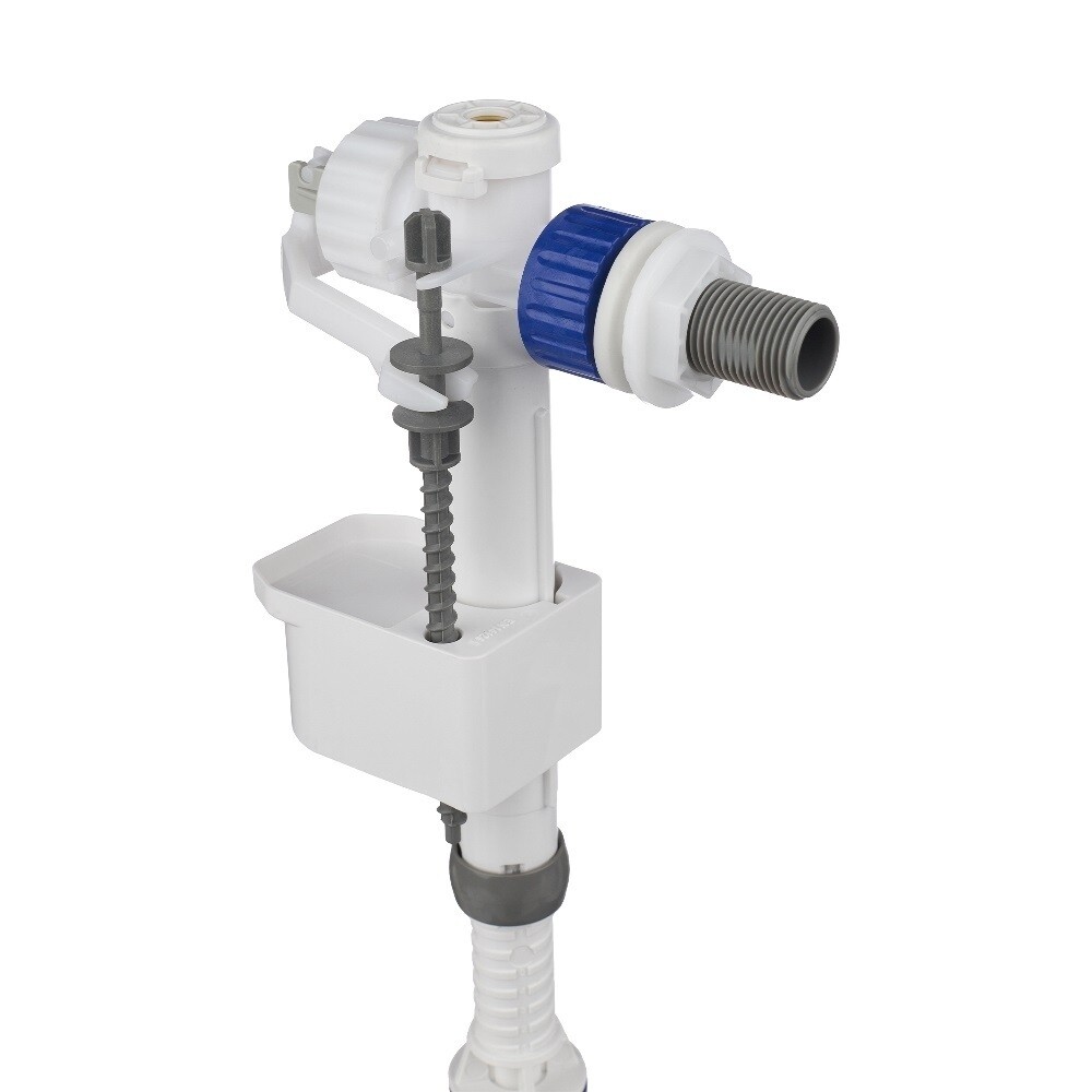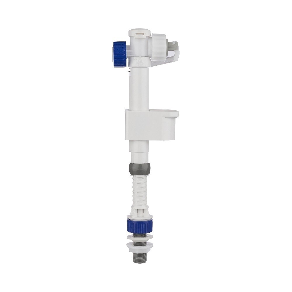 Универсальный наполнительный клапан для смывных бачков с боковым или нижним подключением воды. Подсоединение к водопроводу происходит при помощи пластикового штуцера диаметром 1/2 дюйма или 3/8 дюйма (переходник в комплекте). Клапан выполнен из высокопрочного пластика. Подходит для бачков высотой от 288 до 438 мм. Высота клапана регулируется от 252 до 362 мм.