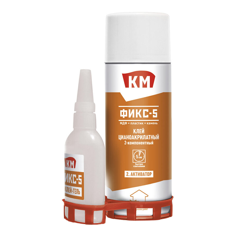 КМ фикс-5 — набор, состоящий из быстро полимеризующегося клея высокой вязкости на цианокрилатной основе и аэрозоля-активатора. Клей идеален для использования на вертикальных поверхностях – не капает и не стекает, подходит для склеивания различных материалов, пористых по структуре, с шероховатой или гладкой невпитывающей поверхностью. Активатор необходим для ускорения процесса склеивания. Подходит для наружных и внутренних работ.