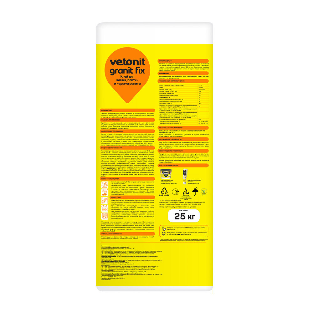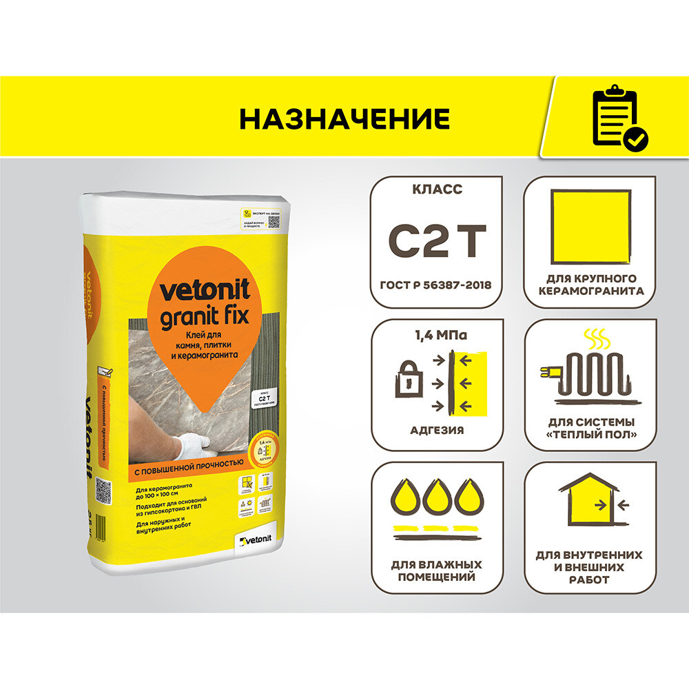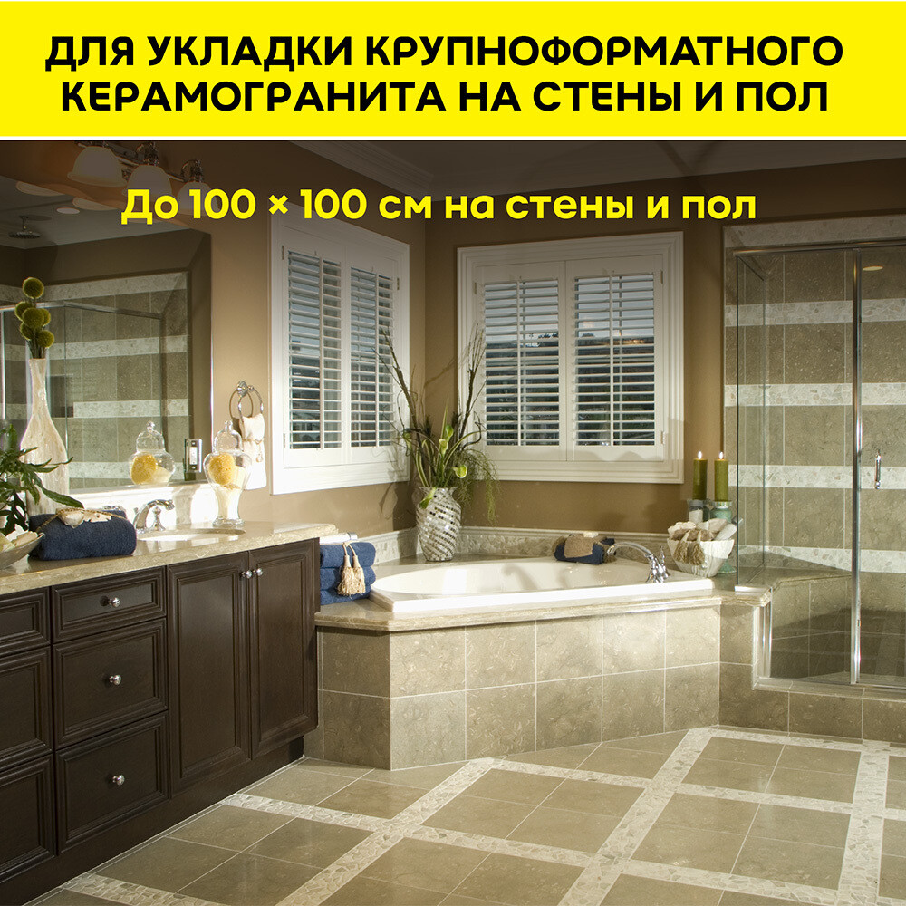 Клей для камня, плитки и керамогранита класса C2 T. Подходит для внутренних и наружных работ. Для стен и пола, включая систему «тёплый пол». Рекомендованный формат керамогранита – крупный, до 100 × 100 см. Совместим с гидроизоляцией, надёжен в эксплуатации во влажных помещениях, а также на балконах, лоджиях, террасах. Походит также для облицовки натуральным и искусственным камнем.