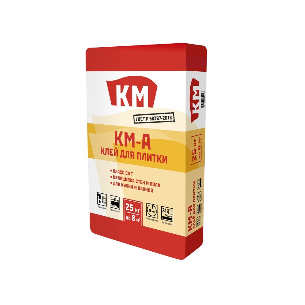 КМ-А предназначен для приклеивания всех типов керамической плитки с водопоглощением не менее 1% и размером не более 30х30 см на поверхности стен и не подогреваемых полов из бетона, железобетона, ячеистого бетона, кирпича, цементных, известково-цементных и гипсовых штукатурок (не ГКЛ!) при внутренних работах в сухих и влажных помещениях. Подходит для кладки блоков и плит из ячеистого, пено- и газобетона, силикатного кирпича с толщиной кладочного шва от 1,5 до 5 мм, а также для выравнивания поверхности стен (толщина слоя за одно нанесение до 10 мм).