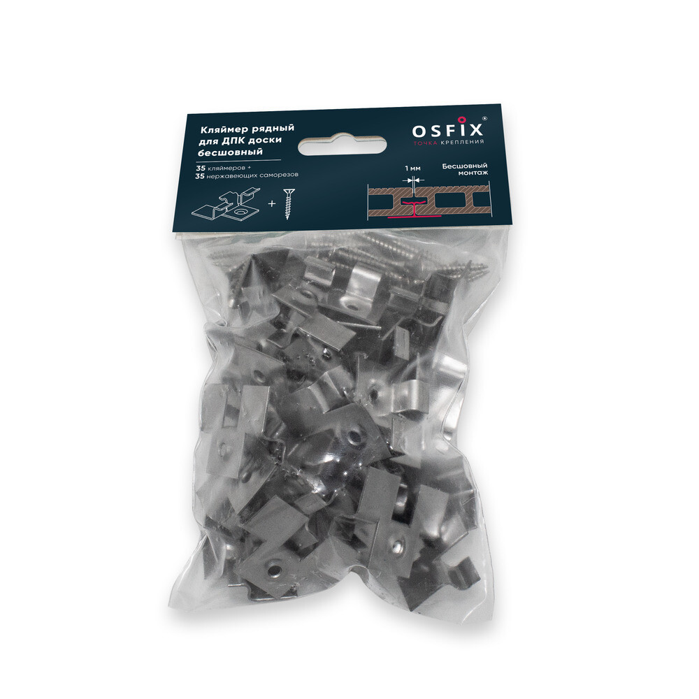 Клипса рядная монтажная Осфикс для бесшовного монтажа доски ДПК с саморезом нержавеющая сталь (35 шт.)