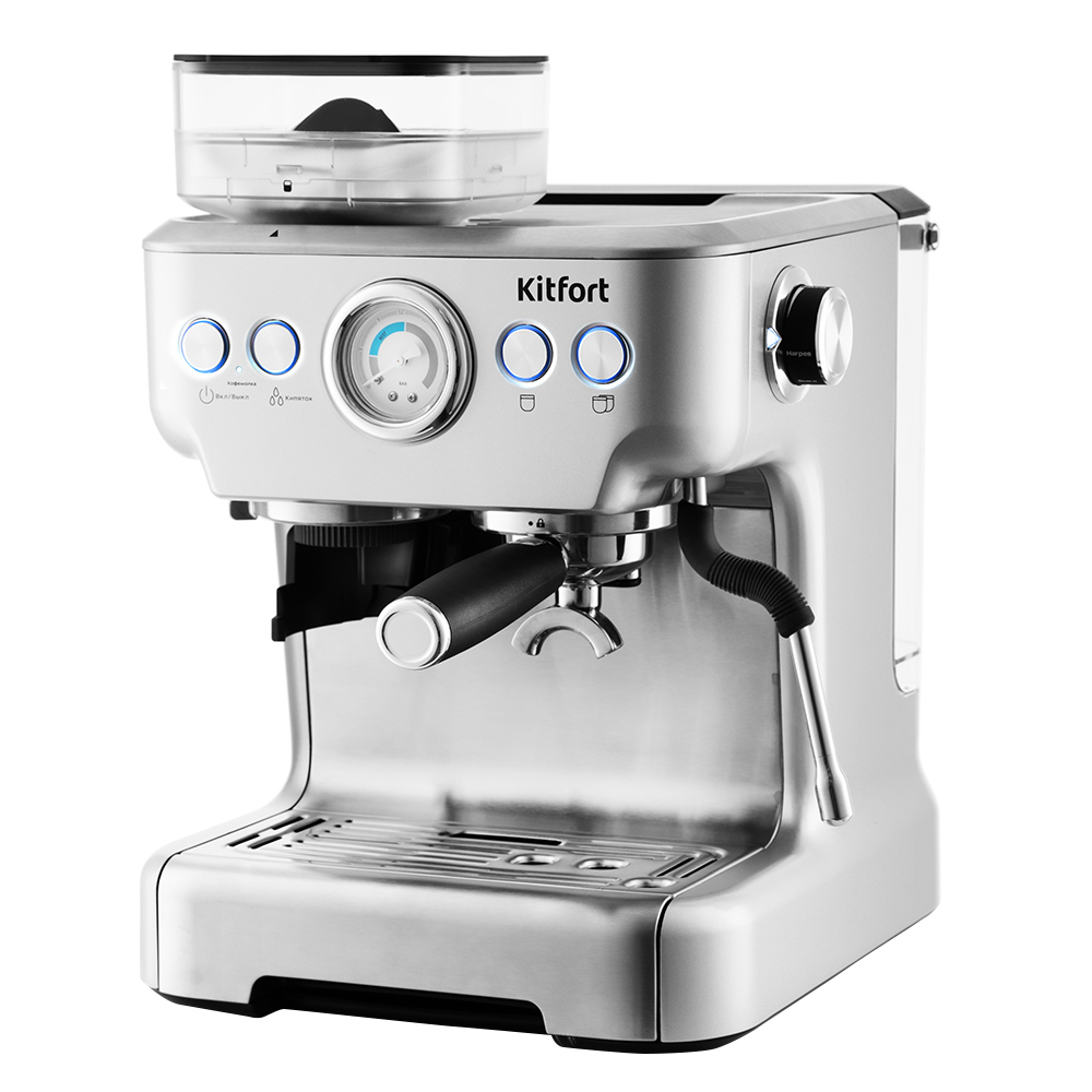 Кофейная станция Kitfort КТ-755 сочетает в себе сразу два устройства. Кофеварка поможет приготовить эспрессо, капучино или латте, а также множество других видов кофе. Встроенная кофемолка измельчит кофейные зерна до нужного помола. На панели управления вы можете задать количество чашек для приготовления ароматного кофе. После нажатия кнопки «Кипяток», кофеварка вскипятит 180 мл воды, затем выберите крепость «Эспрессо» и устройство приготовит кофе. Помпа с давлением 20 бар и встроенный манометр позволят добиться оптимальной экстракции кофе любых сортов. На шкале маномерта зона «BEST» покажет оптимальное давление для приготовления идеального кофе. Кофемолка измельчает кофейные зерна непосредственно перед приготовлением. Контейнер вмещает в себя до 200 грамм зерен кофе. Конические жернова делают помол равномерным, а с помощью регулятора можно выбрать нужную вам степень помола от 1-го до 15: от мелкого для эспрессо до крупного для френч-пресса. Капучинатор в кофеварке — это паровая трубка с насадкой панарелло. Трубку погружают в холодное молоко, включают подачу пара и взбивают молочную пенку. Поддон для сбора капель с решеткой из нержавеющей стали легко снимается, моется и устанавливается обратно. Резервуар для воды объемом 2,7 литра снимается и наполняется водой. В комплекте к кофейной станции идут два фильтра, рожок, мерная ложка, кисточка для очистки и темпер. Темпер используется для утрамбовки молотого кофе.