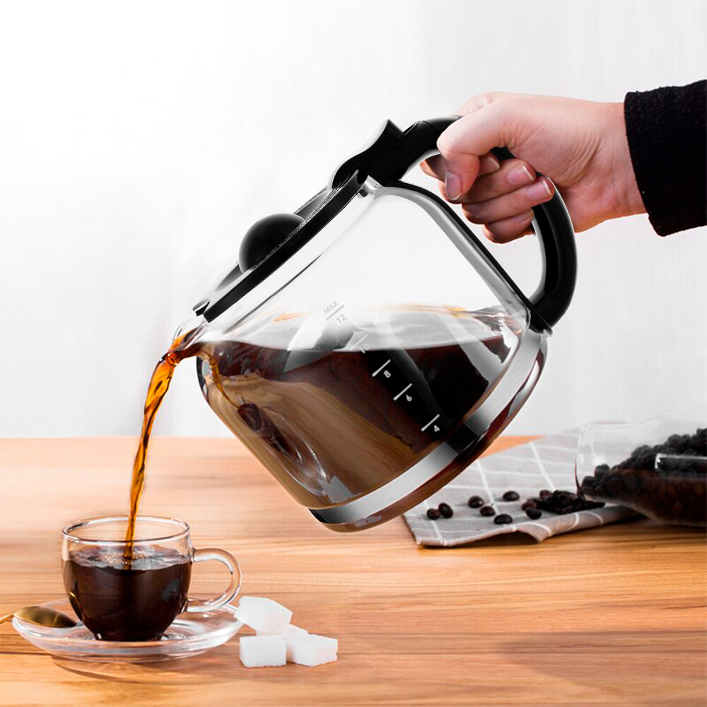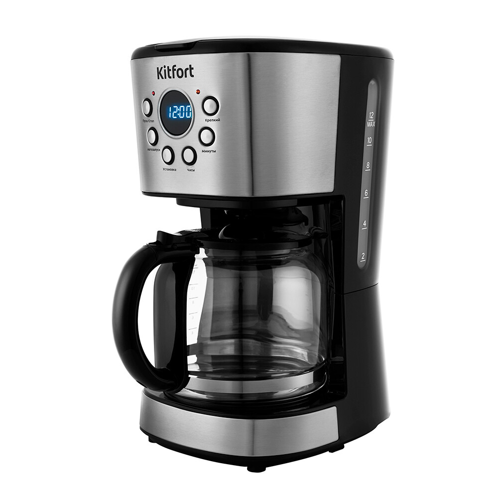Капельная кофеварка Кіtfort КТ-728 поможет приготовить ароматный кофе из молотого кофе. Режим автозапуска позволит настроить автоматическое приготовление кофе к нужному часу. В установленное время кофеварка автоматически начнет приготовление, а по окончании приготовления перейдет в режим подогрева. Платформа с подогревом, на которой стоит кофейник с готовым кофе, будет горячей в течение 40 минут, затем кофеварка выключится. Кофеварка оборудована противокапельной системой — затвором, приостанавливающим подачу кофе при вынимании кофейника из кофеварки. Вы можете налить кофе в чашку, не дожидаясь окончания приготовления. Резервуар емкостью 1,5 л позволяет за один раз приготовить кофе на 12 чашек емкостью 120 мл. Корпус кофейника прозрачный. Кофеварка оснащена многоразовым нейлоновым фильтром, который удобно мыть после приготовления кофе и использовать снова.