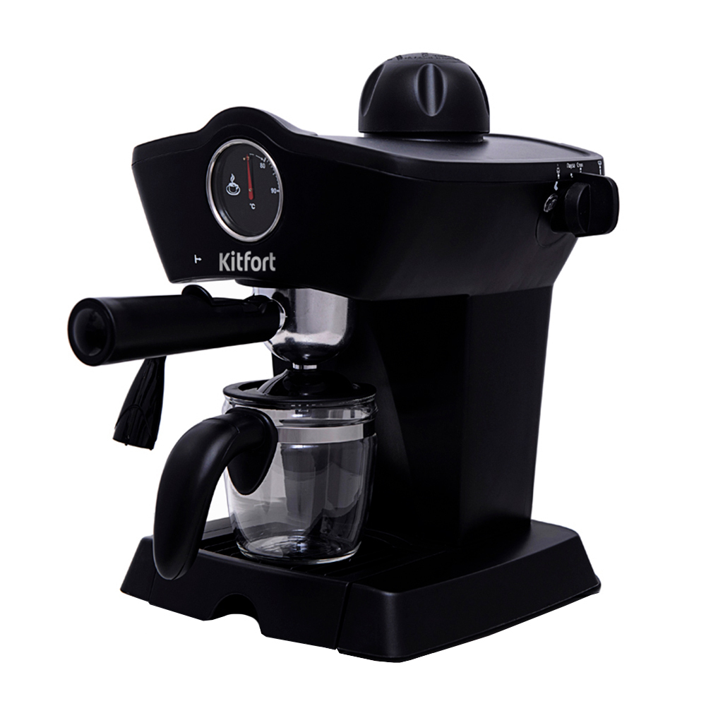 Рожковая полуавтоматическая эспрессо-кофеварка Кіtfort КТ-706 может приготовить до 4 чашек кофе за один раз, оснащена функцией взбивания молока для приготовления капучино, латте, торо, а также поможет разогреть напитки горячим паром. Принцип действия кофеварки Кіtfort КТ-706 основан на пропускании горячей воды под давлением в несколько атмосфер через слой молотого кофе. Температура воды контролируется встроенным термостатом. Готовый кофе наливается в подставленную чашку или специальный кофейник, идущий в комплекте. Корпус кофеварки выполнен из пластика. На панели управления установлен термометр для отображения температуры воды в бойлере. Металлический фильтр с лазерным нанесением отверстий долговечен и не требует использования каких-либо расходных материалов.