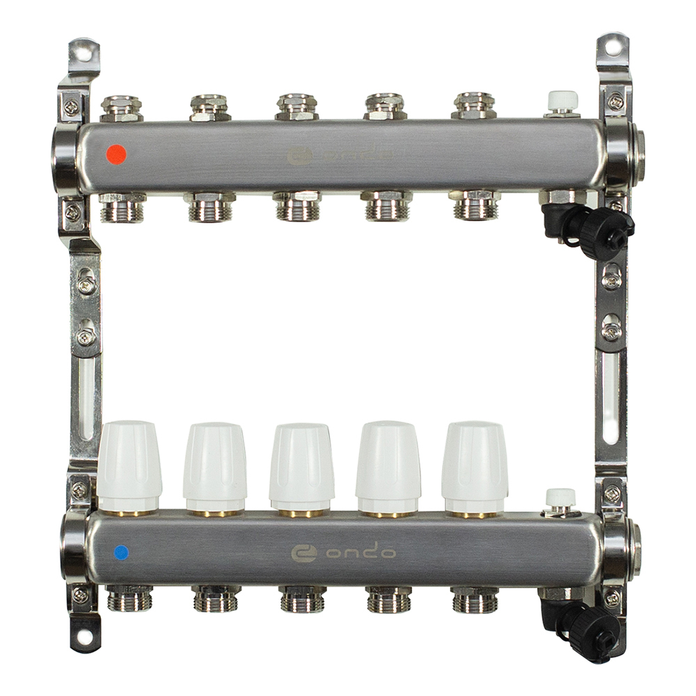 Коллекторная группа ONDO из нержавеющей стали предназначена для оптимизации, контроля и распределения теплоносителя в системах радиаторного и напольного отопления. Коллекторная группа — важный элемент водяного теплого пола. Благодаря ей происходит смешивание горячей и холодной жидкости. Такая особенность позволяет произвести регулировку температуры теплого пола и контролировать его работу. Коллекторная группа ONDO может работать на водяном, либо этиленгликолевом теплоносителе с максимальным содержанием гликоля не более 45%. Коллекторная группа поставляется предварительно в собранном виде. Воздухоотводчик и дренажный кран встроены в корпус. Материал корпуса — нержавеющая сталь. Установочные кронштейны входят в комплект. Насосно-смесительный узел приобретается отдельно. Данная модификация построена на использовании термостатических и запорных клапанов. Детали коллекторной группы соединены между собой на заводе с помощью уплотнительных колец и герметизированы специальным анаэробным клеем. Это позволяет отказаться от дополнительных герметизирующих и уплотнительных материалов при установке. Изделие соответствует требованиям ГОСТ 12.2.063–2015.