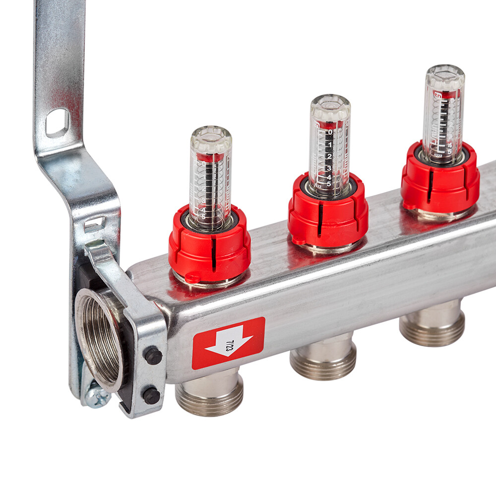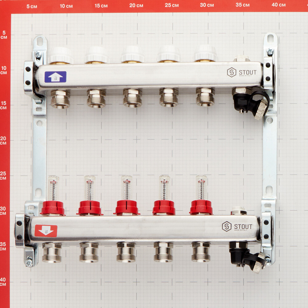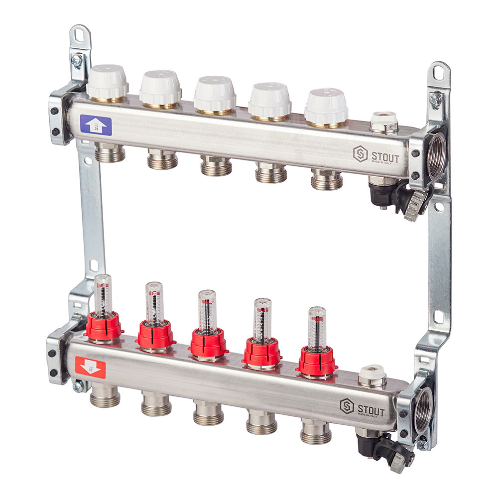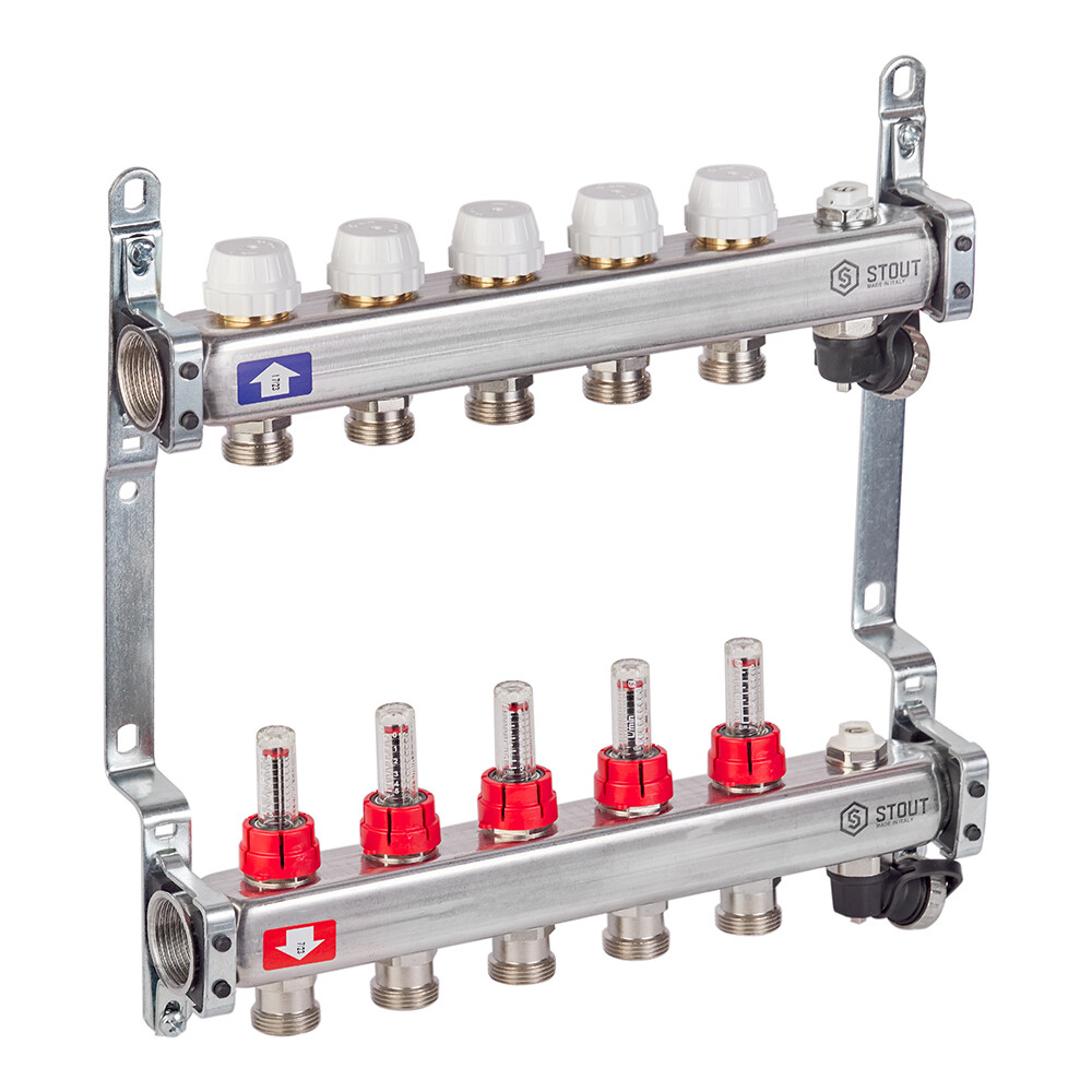 Коллекторная группа с расходомерами нержавеющая сталь Stout 1 ВР(г) х 5 выходов 3/4 НР(ш) ЕК х 1 ВР(г)