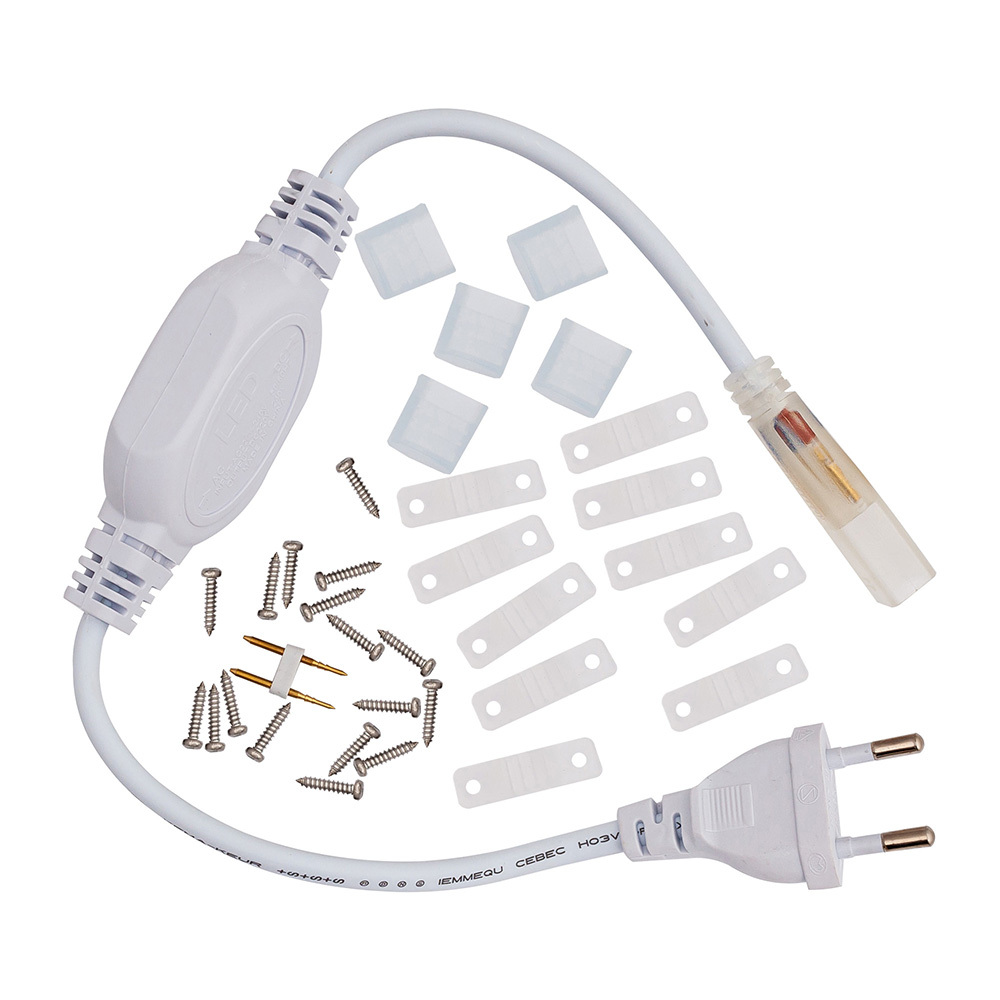 Монтажный комплект для высоковольтной одноцветной светодиодной ленты. Предназначен для тех случаев, когда осветительную систему не хочется перегружать массивными источниками питания. Достаточно просто подключить светодиодную ленту 220В к специальному диодному проводу, закрепить кронштейнами-фиксаторами, которые имеются в комплекте и Ваше помещение наполнится изумительной, таинственной скрытой подсветкой. Один конец LED изделия подключают к разъемам коннектора, с другой стороны устанавливают заглушку с целью изоляции открытых контактов.