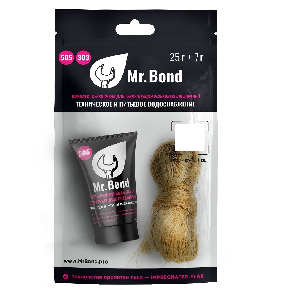 Комплекты сервисмена QuickSpacer Mr.Bond 507 и QuickSpacer Mr.Bond 505 подобраны с учетом совместного расхода льна и пасты для рационального использования и работ без остатков лишних материалов. Вы обеспечиваете 100% герметичность соединения.