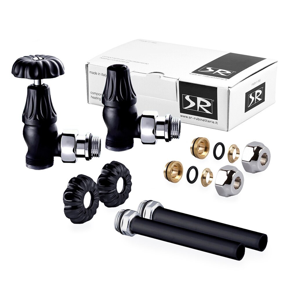 Комплект угловых вентилей SR Rubinetterie серия Floral Old Style, соединения для медных и многослойных труб. Трубки, изготовленные из латуни, имеют декоративные отражатели, которые по дизайну сочетаются с клапанами радиатора.