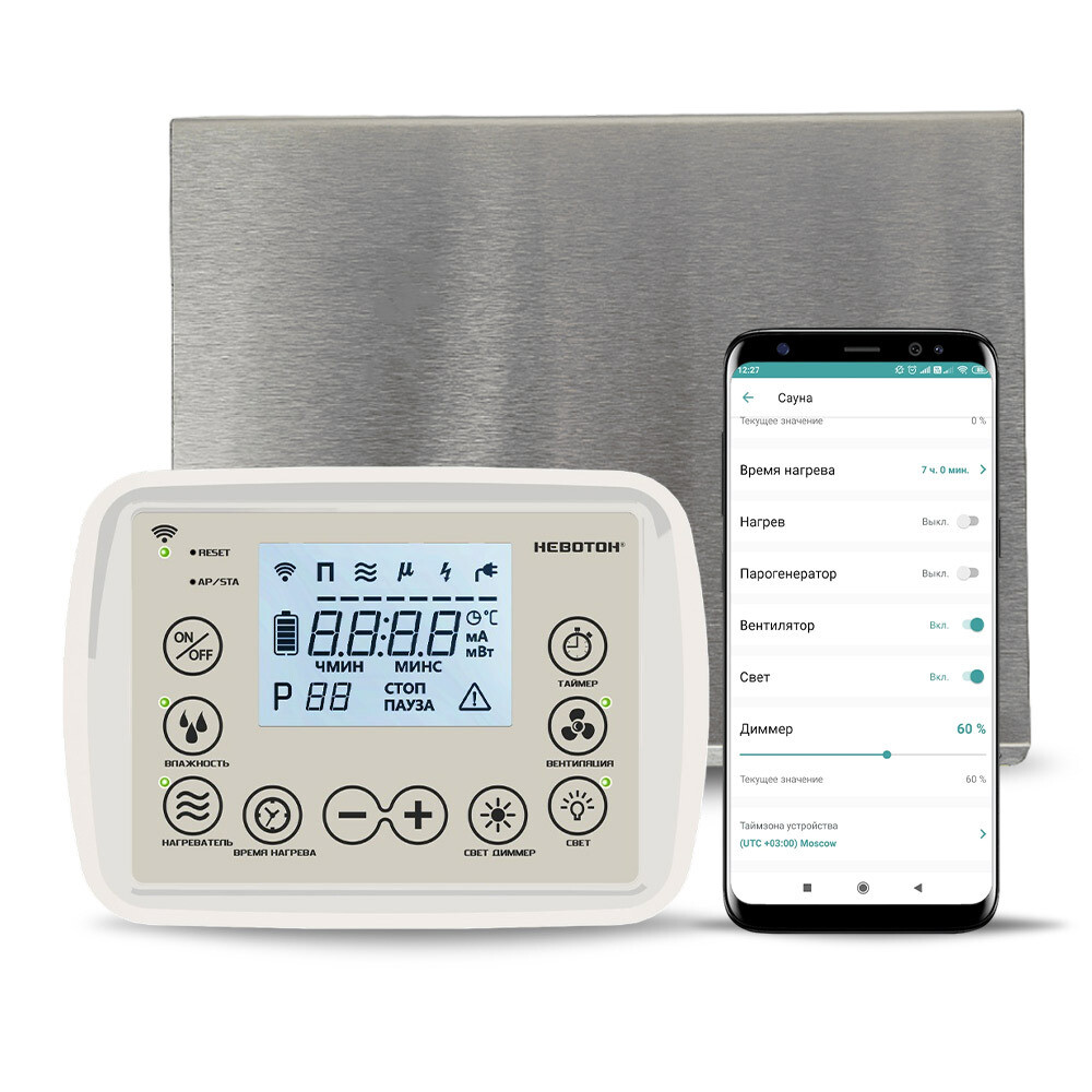 Комплекс управления сауной «Невотон Комфорт» дает возможность управлять дистанционно всеми функциями и параметрами сауны в приложении смартфона. Комплекс универсален: работает с электропечами и парогенераторами разных производителей. Возможно подключение устройства как к однофазной, так и к трехфазной сети электропитания. Суммарная мощность подключаемого оборудования до 25 кВт. Связь с устройством осуществляется по Wi-Fi-сети.