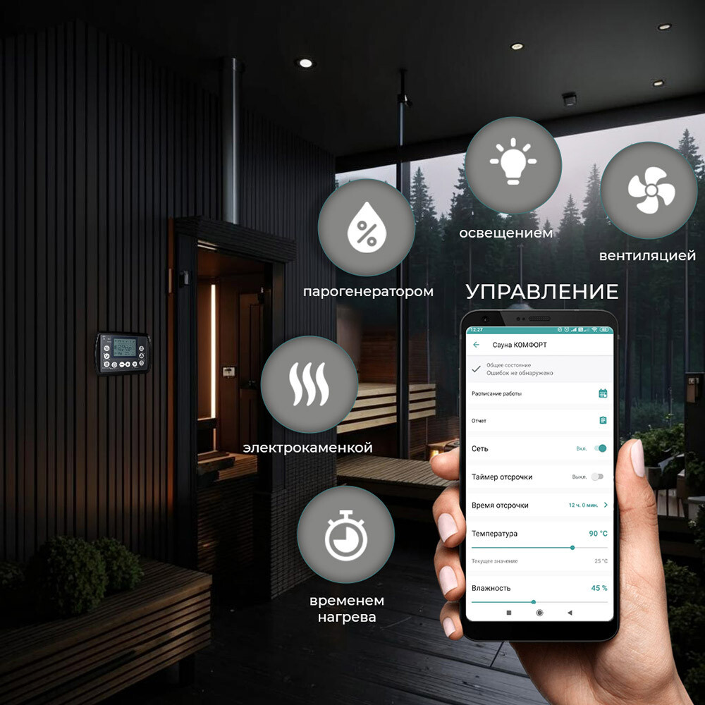Комплекс управления сауной «Невотон Комфорт» дает возможность управлять дистанционно всеми функциями и параметрами сауны в приложении смартфона.
