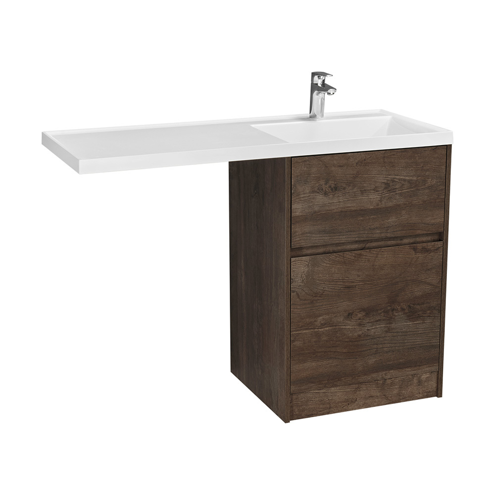 Тумба Лондри под стиральную машину выполнена из влагостойкой ламинированной плиты в древесной отделке. Корпус тумбы и фасад приобретаются отдельно. Тумбы комплектуются фасадами как с такой же древесной текстурой, так и в универсальном белом глянцевом цвете – это позволяет выбрать модель тумбы в соответствии с личными предпочтениями, создав наиболее удачное решение для конкретного интерьера ванной комнаты. Более того, при желании в одной тумбе можно совместить корпус и фасады в двух разных по оттенку древесных декорах. Верхний ящик открывается с помощью системы push-to-open, а нижний — за фасад с помощью удобного выпила под углом. Ящики выдерживают нагрузку до 25 кг. Тумба установлена на регулируемые опоры, которые находятся за цоколем. Тумба комплектуется раковиной Лондри 120 из прочного литого мрамора, который устойчив к воздействию химических средств. Широкое крыло раковины обеспечивает ванную комнату дополнительным функциональным пространством. Дополнительно к тумбе можно приобрести шкаф-колонну Лондри и зеркальный шкаф Лондри 120.