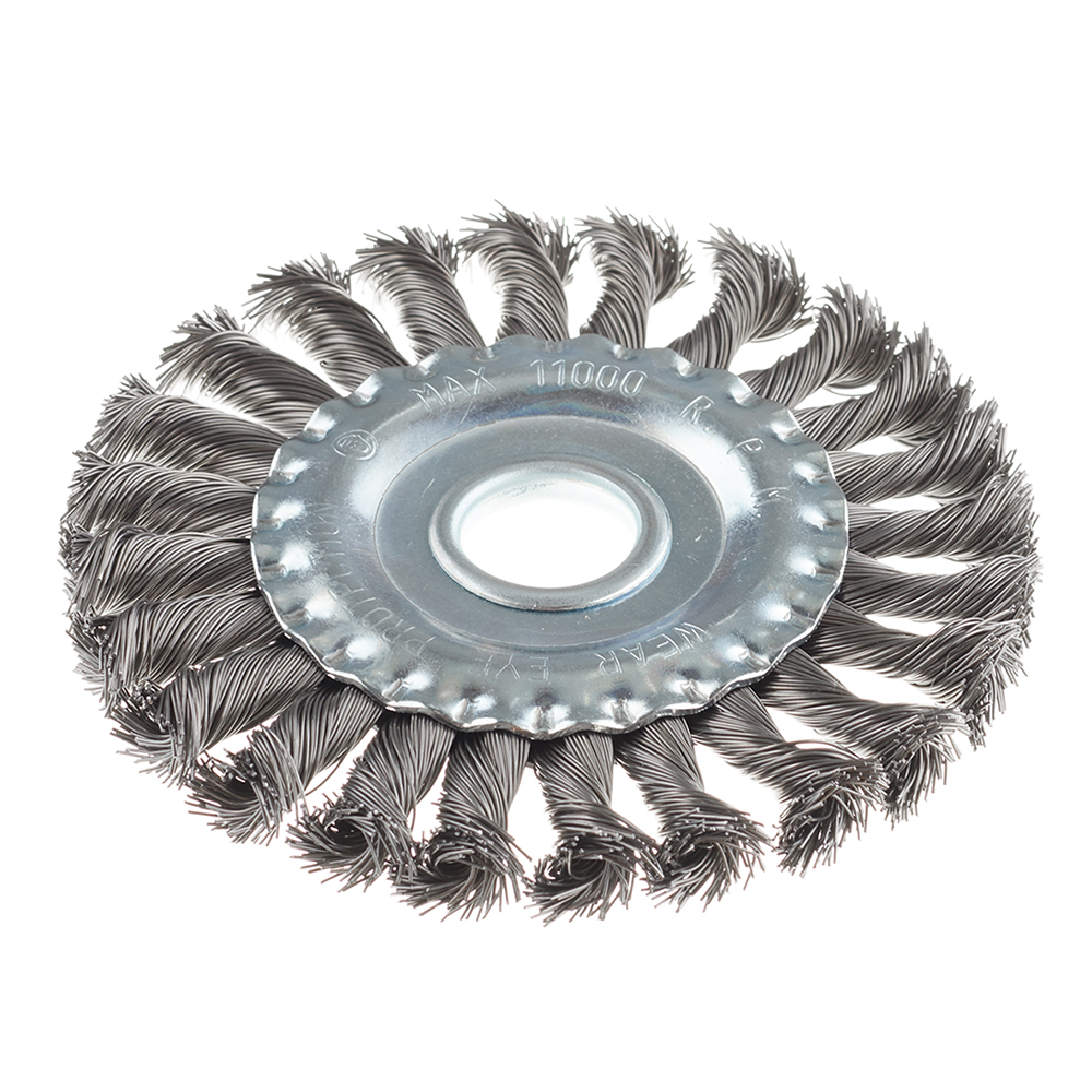 Кордщетка для угловых шлифмашин. Крепление планшайбой шлифмашины. Витая стальная проволока. Для грубой обработки деревянных и металлических поверхностей в труднодоступных местах, снятия краски, ржавчины, обработки сварных швов.