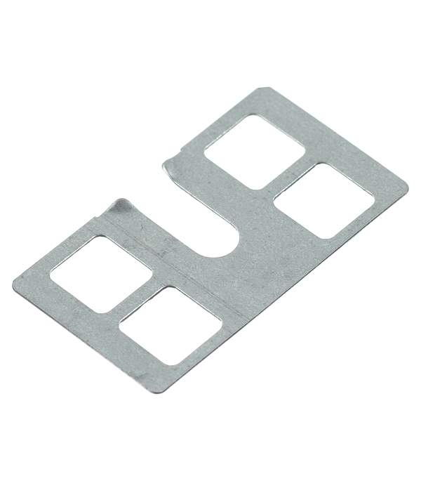 Крепления изготовлены из оцинкованного металла толщиной 0,4 мм. Представляют собой прямоугольную пластину с высеченными отверстиями и направляющими загибами в её центральной части. Применяются для установки маячковых профилей 6 мм и 10 мм, для дальнейшего оштукатуривания или обустройства стяжки.