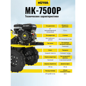 Сельскохозяйственная машина Huter MK-7500Р имеет ременной привод активной навески. Мотоблок имеет 3 передачи – 2 вперёд и 1 назад. Ширина обработки почвы зависит от размеров лезвий и в базовой комплектации составляет 100 см. Если необходимо, возможна обработка узких полос земли. Для этого нужно отсоединить составные части фрез. Диаметр фрез – 30 см, регулировать глубину обработки можно с помощью сошника.