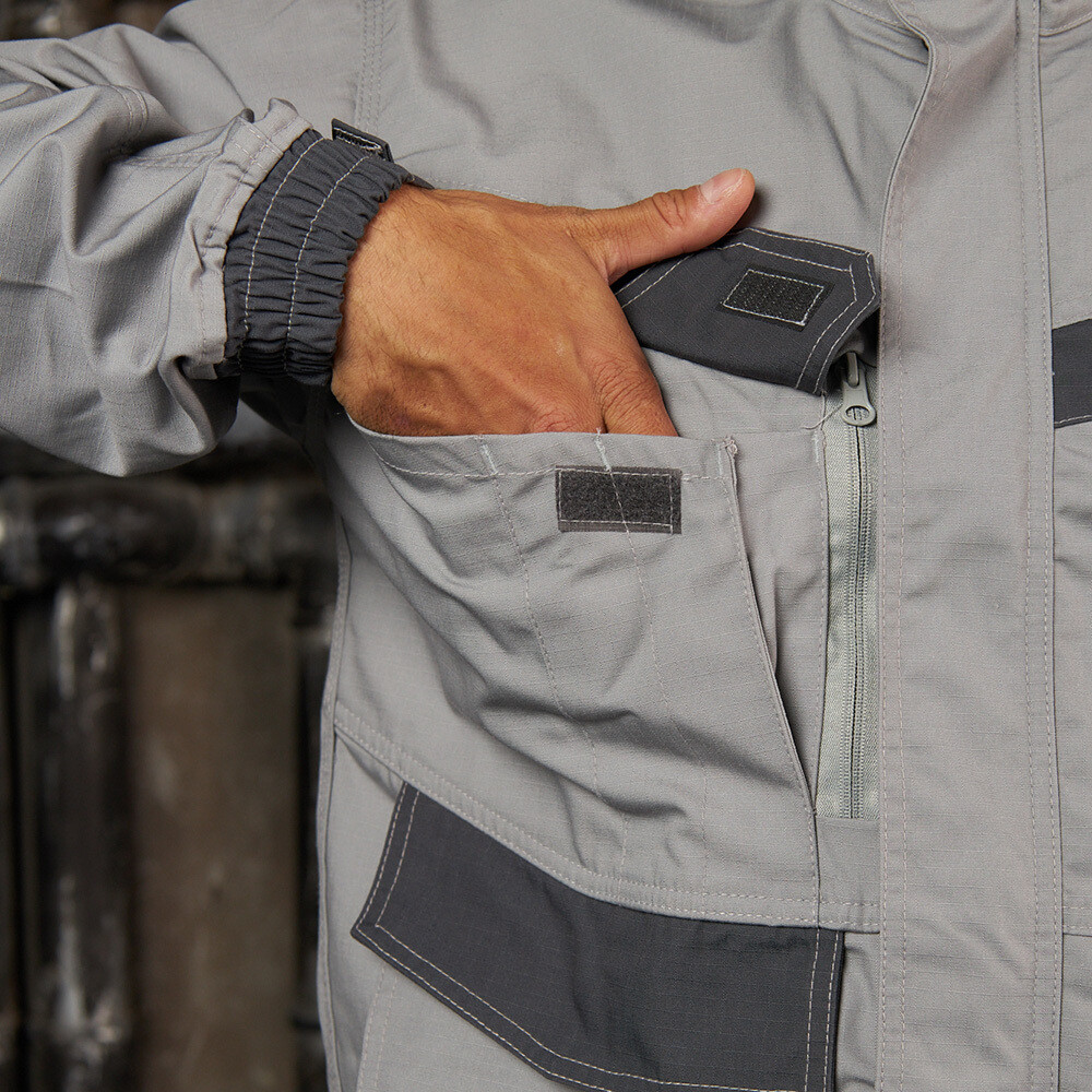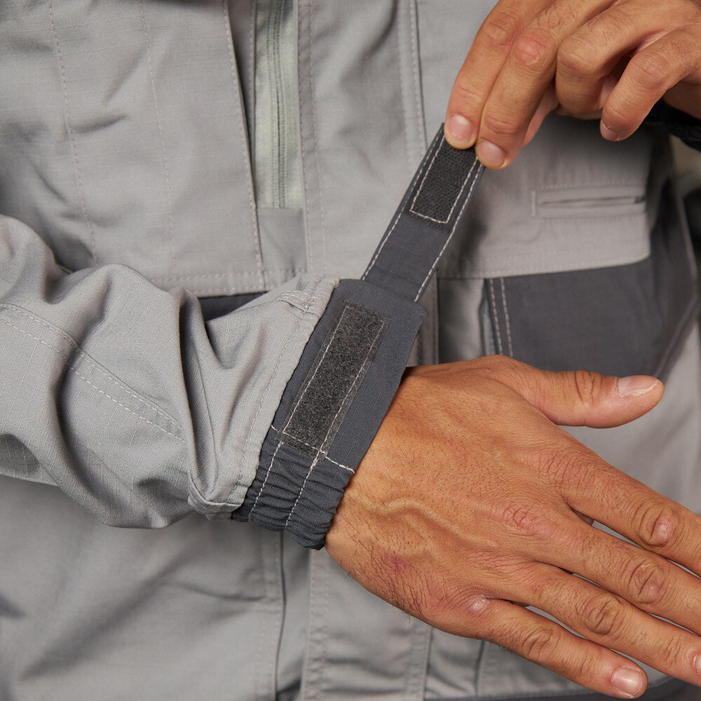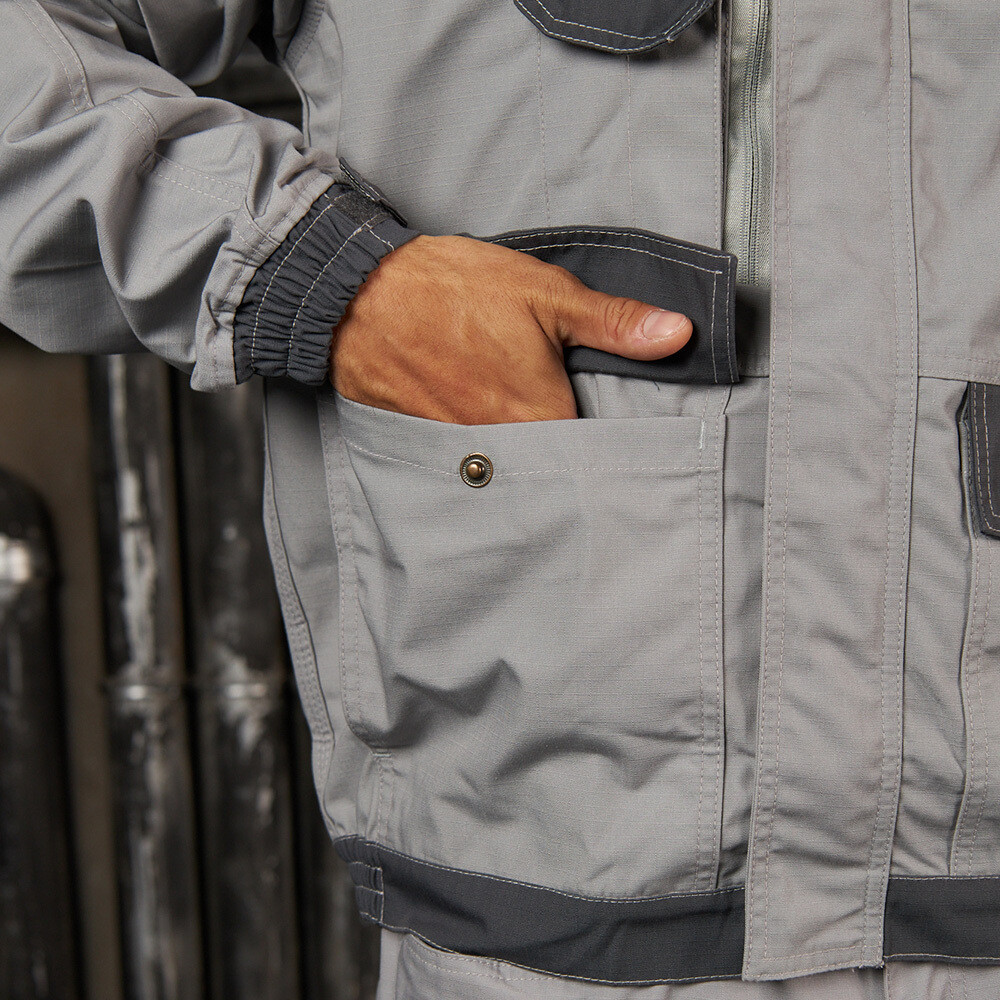 Куртка прямого силуэта, с центральной застежкой-молнией, закрытой ветрозащитным клапаном, с воротником-стойкой, с большим количеством накладных и прорезных карманов. Рукава с локтевым швом, манжеты с эластичной вставкой, застегивающихся с помощью контактной ленты. По низу куртки –пояс с эластичными вставками по бокам. Усиленные тройные швы. Повышенные прочностные свойства ткани благодаря технологии Рипстоп.