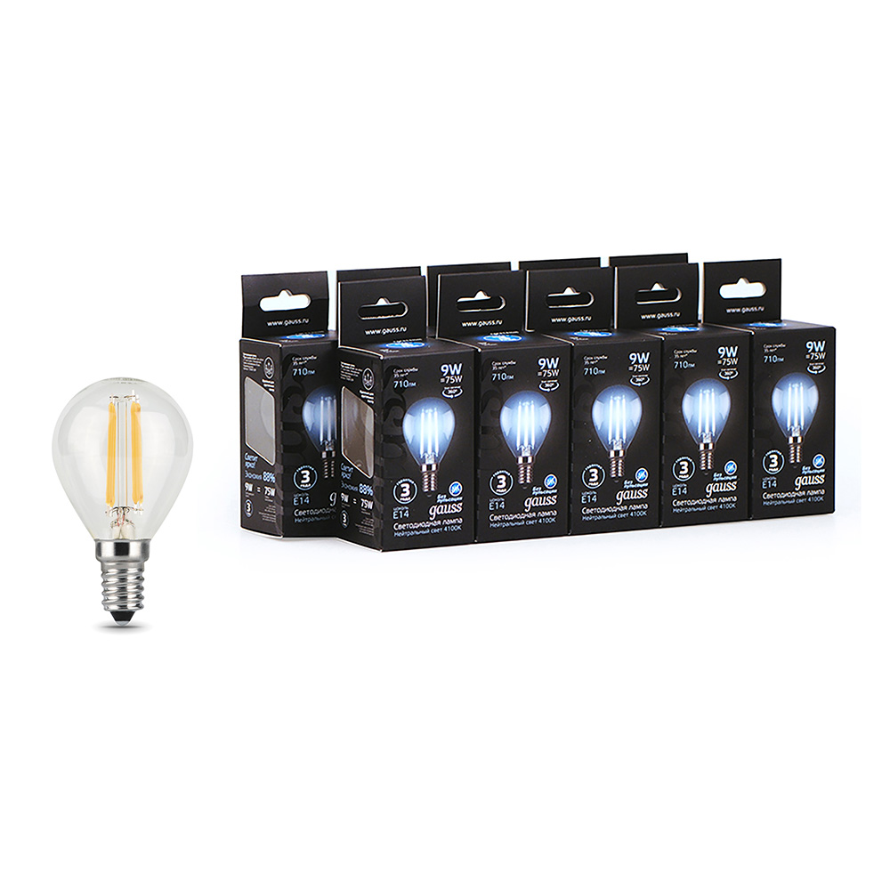 Лампа светодиодная филаментная Gauss E14 4100К 9 Вт 150-265 В шар прозрачная (10 шт.)