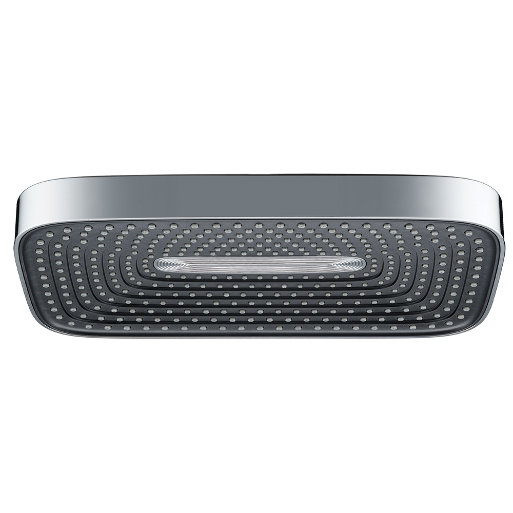 Лейка для верхнего душа с покрытием хром. Душевая сетка черная, форсунки серые. Размер 320 х 210 мм. Увеличенная толщина душевой части — 30 мм. Сочетается с душевой лейкой AGD 20.1322 B.