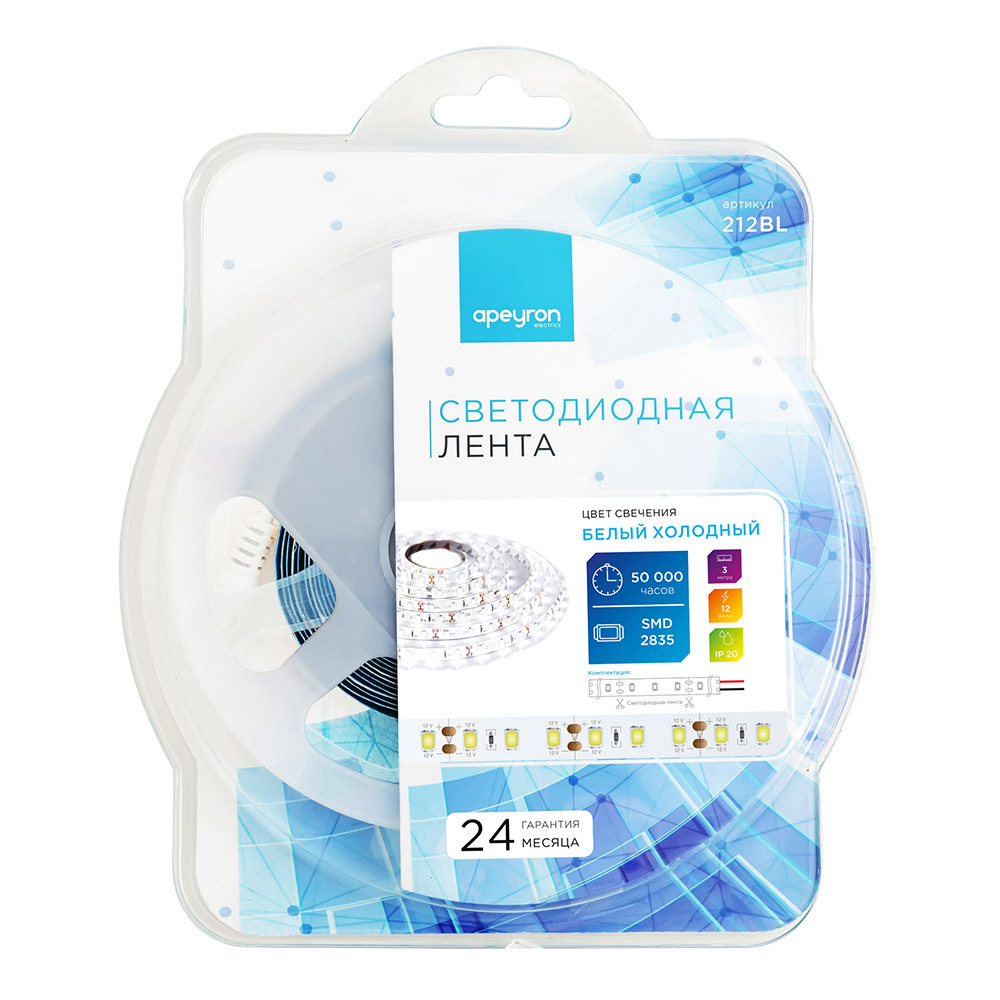 Лента светодиодная SMD 2835 6500К 12 В 14,4 Вт/м 3 м IP20 Apeyron (212BL)