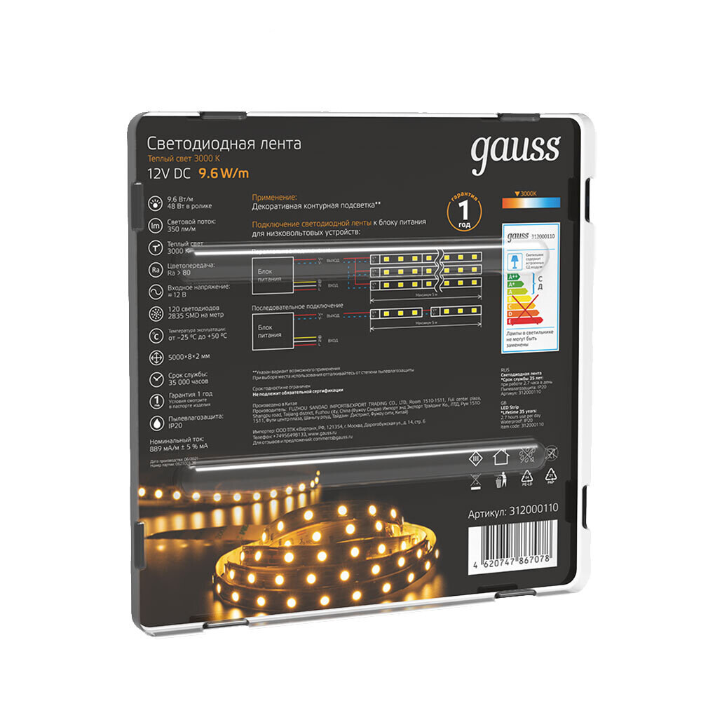 Лента светодиодная SMD 2835 Gauss 3000К 12 В 9,6 Вт/м 5 м IP20 (312000110)
