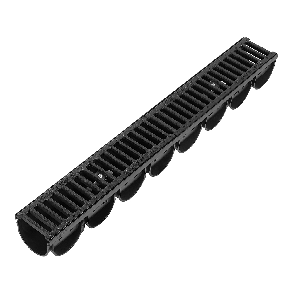 Конструкция канала усилена за счет наличия специальные ребер жесткости. Предусмотрены шаблоны для горизонтального крепления с другими лотками и места для вертикального подсоединения канализационных труб. Укомплектован двумя чугунными дренажными щелевыми решетками длинной 500 мм.