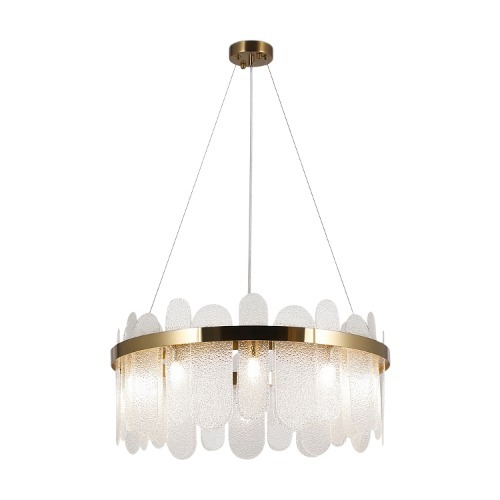 Предназначена для декоративного, интерьерного и общего освещения различных помещений. Металлическая арматура благородного оттенка латуни служит идеальной оправой для стеклянных элементов. Их модная фактурная поверхность создает эффект «замороженного стекла». Такой прием добавляет дизайну индивидуальности и образует красивую игру световых бликов и переливов – лучи света мягко преломляются рельефным узором. Серия включает две подвесные люстры различного диаметра, а также бра для эффектной зональной подсветки. Элегантные светильники отлично подойдут для интерьеров в стиле неоклассика, ар-деко, модерн, эклектика. Лампы в комплект не входят.