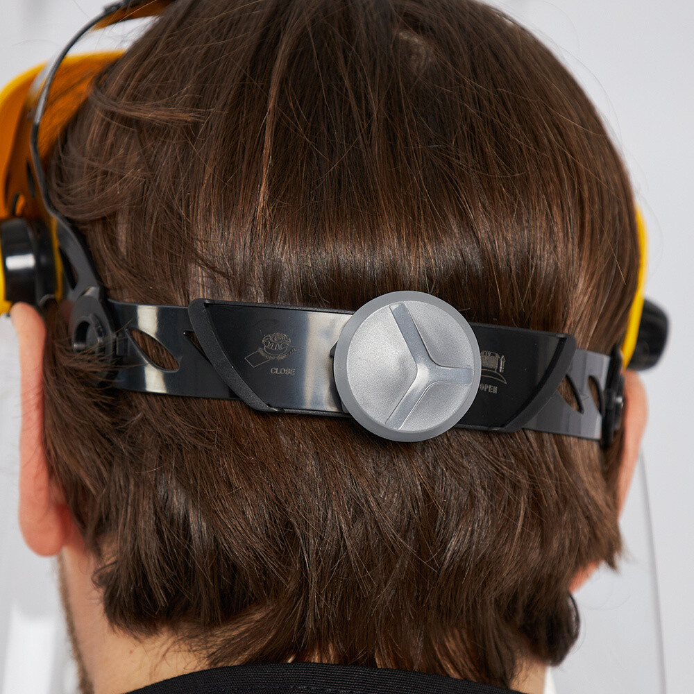 Крепление для защитных щитков с регулируемым оголовьем. Защита лобной части. Регулировка по обхвату головы (от 53 до 63 см) с помощью системы затяжения ROTOR.