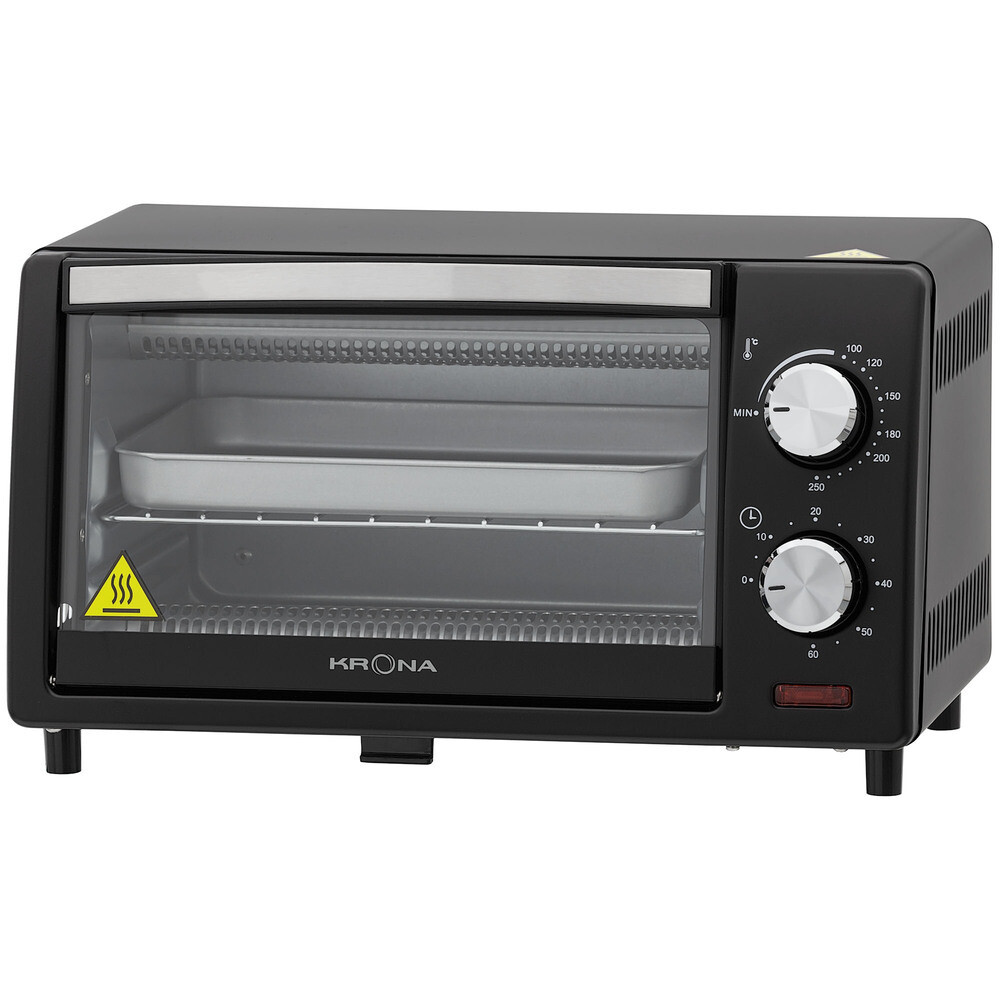 Электрическая мини-печь Krona с мощностью 800 Вт и механическим управлением дает возможность плавно регулировать температуру от 100 до 250 градусов, устанавливать таймер от 0 до 60 минут, который сопровождается звуковым сигналом по окончании работы. Печь имеет 2 кварцевых нагревательных элемента, индикатор работы, стеклянную дверцу и прорезиненные ножки. Нижняя пластина корпуса выступает открывающимся поддоном для крошек. Ручка дверцы не нагревается.