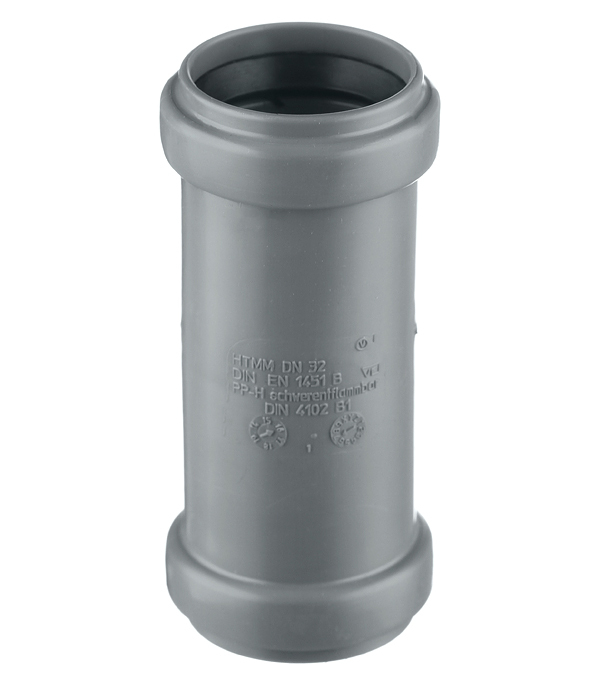 Внутренняя система канализации Ostendorf HT. Муфта двойная, предназначена для соединения безраструбных частей труб и фитингов, центральный упор внутри муфты обеспечивает соединение равных участков и в случае необходимости облегчает выставление отступа с расчётом на тепловое расширение.