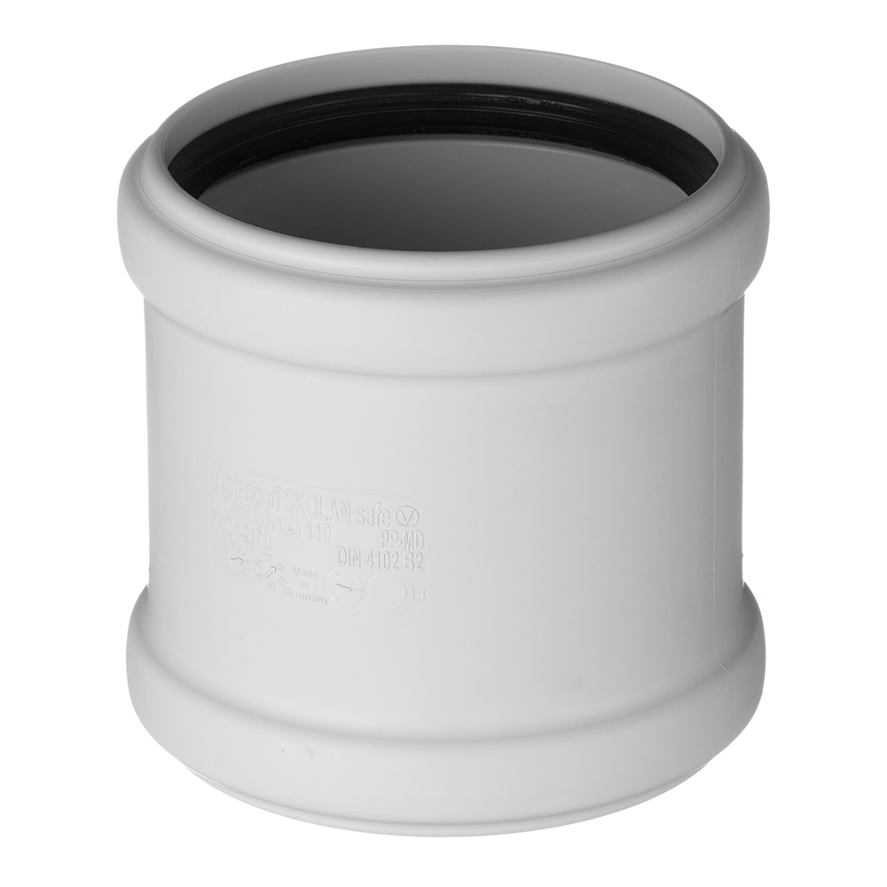 Внутренняя система бесшумной канализации Ostendorf Skolan Safe. Муфта двойная, предназначена для соединения безраструбных частей труб и фитингов, центральный упор внутри муфты обеспечивает соединение равных участков и в случае необходимости облегчает выставление отступа с расчётом на тепловое расширение.