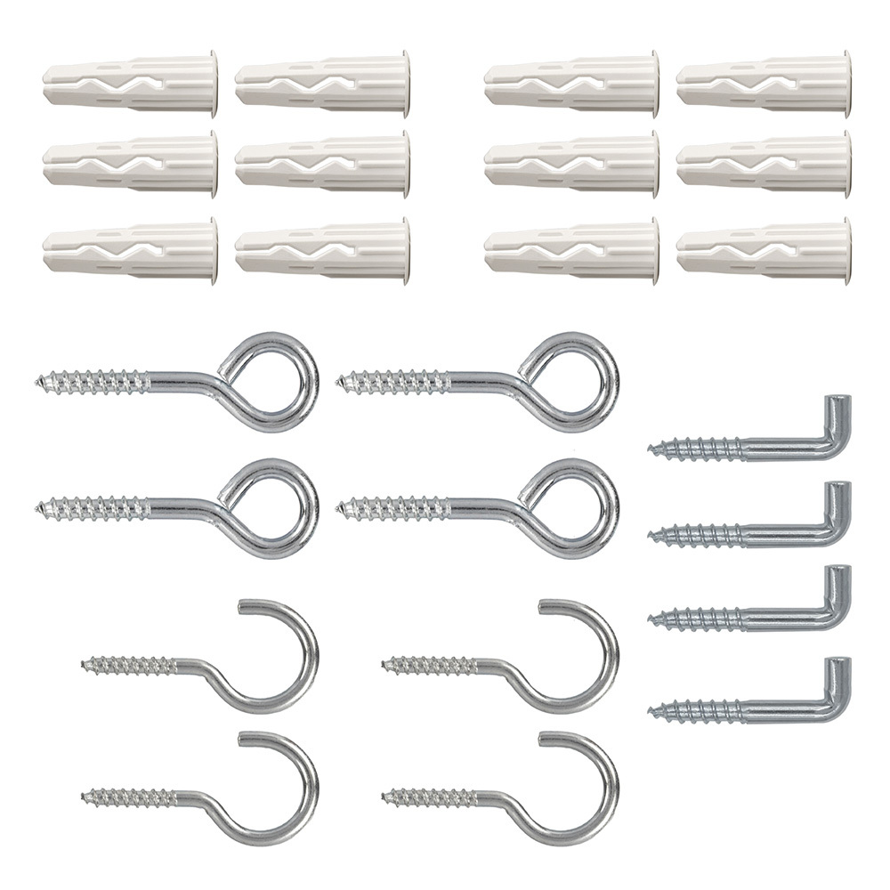 Состав комплекта: Дюбель 6×25 мм нейлон — 12 шт., Крюк-шуруп 3,9×40/D13 мм оцинкованная сталь — 4 шт., Крюк-шуруп L-образная 3,6×30 мм оцинкованная сталь — 4 шт., Петля-шуруп 4,1×30/D9,6 мм оцинкованная сталь — 4 шт.