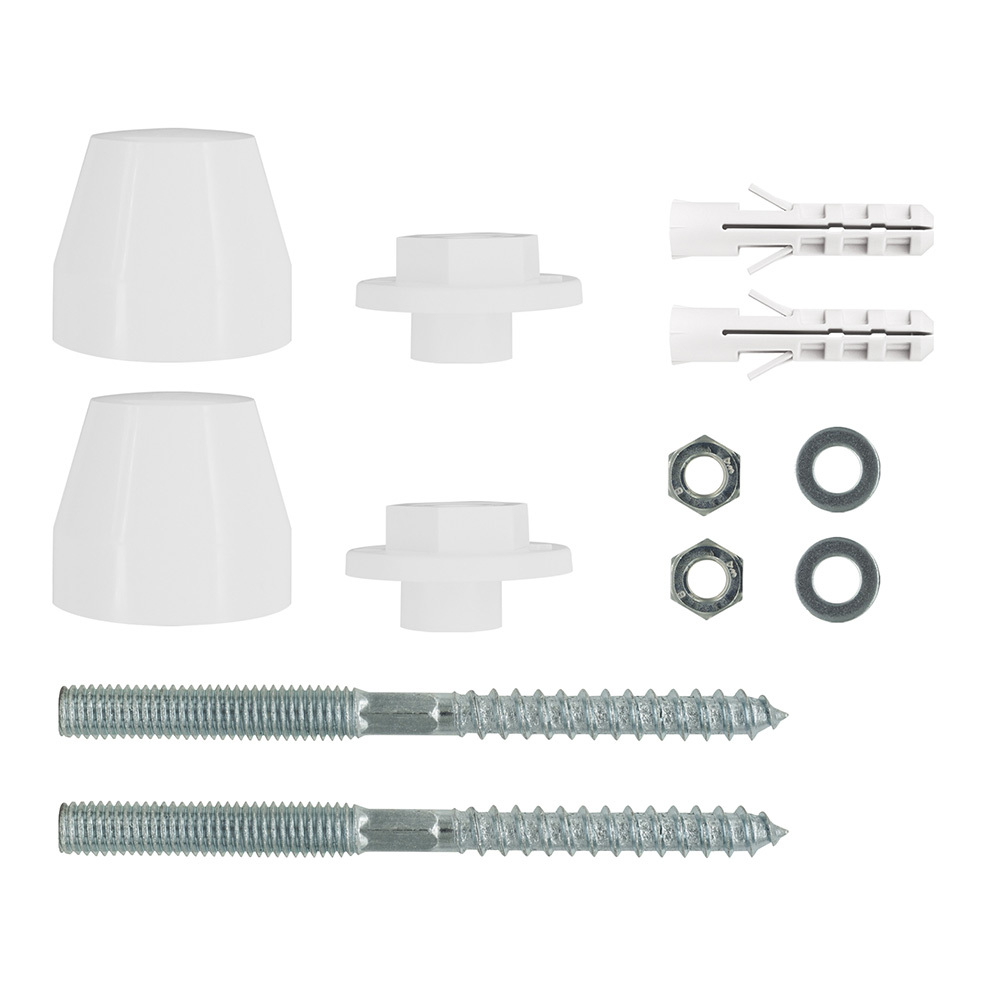 Состав комплекта: Дюбель универсальный 10×50 мм — 2 шт.; Шпилька сантехническая 8×100 мм TORX T25 оцинкованная сталь — 2 шт., Гайка — втулка с заглушкой d 40 мм полиэтилен — 2 шт., Гайка DIN 934 М8 оцинкованная сталь — 2 шт., Шайба DIN 9021 М8 оцинкованная сталь — 2 шт.