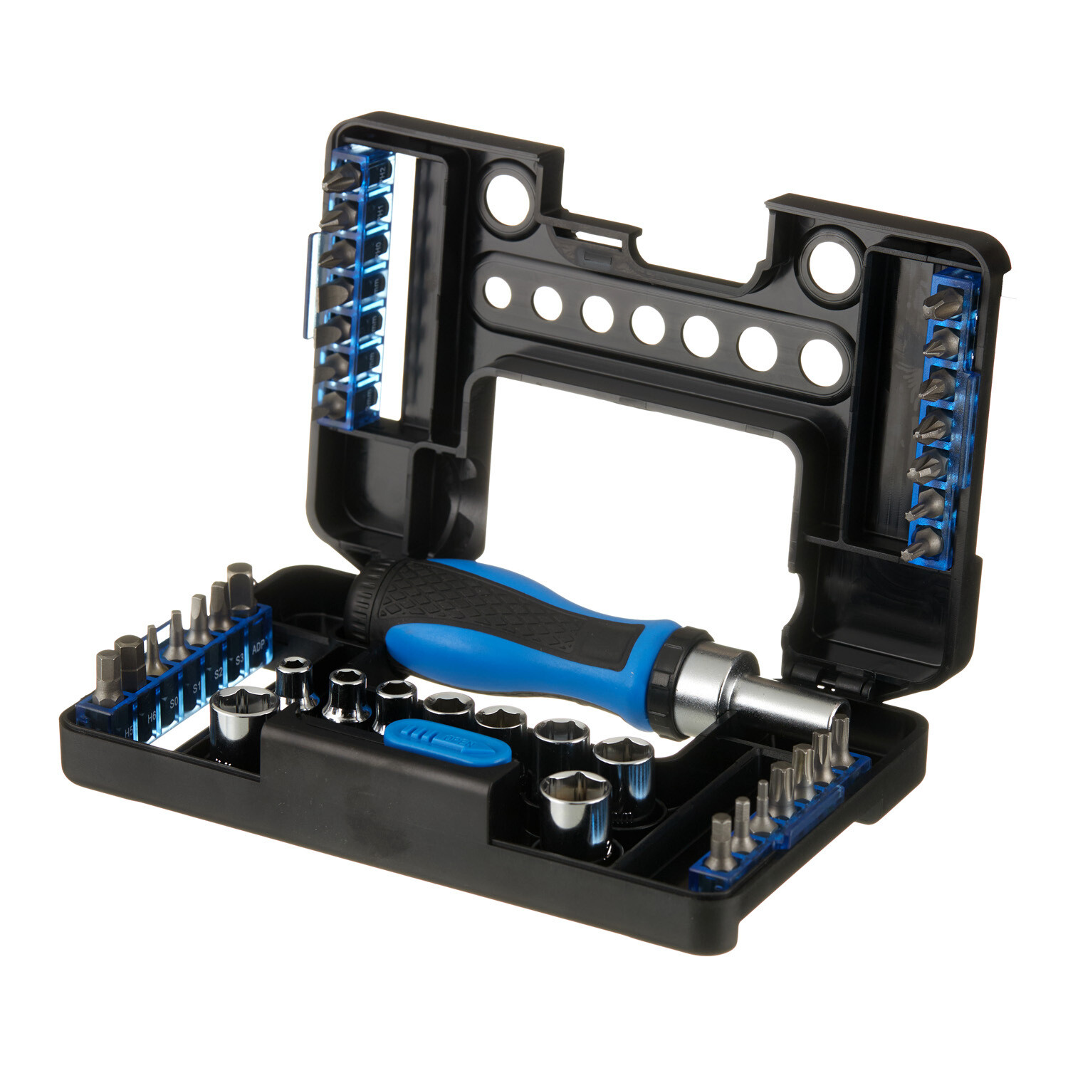 Состав набора: биты шлиц 3, 4, 5, 6 мм; биты PH- PH0, PH1, PH2, PH3; биты PZ- PZ0, PZ1, PZ2, PZ3; биты TORX T10, T15, T20, T25, T27, T30: биты шестигранные H2, H3, H4, H5, H6; биты квадратные S0, S1, S2, S3; головки шестигранные 1/4’’- 4, 5, 6, 7, 8, 9, 10, 11, 12 мм; адаптер для установки бит; реверсивная отвертка