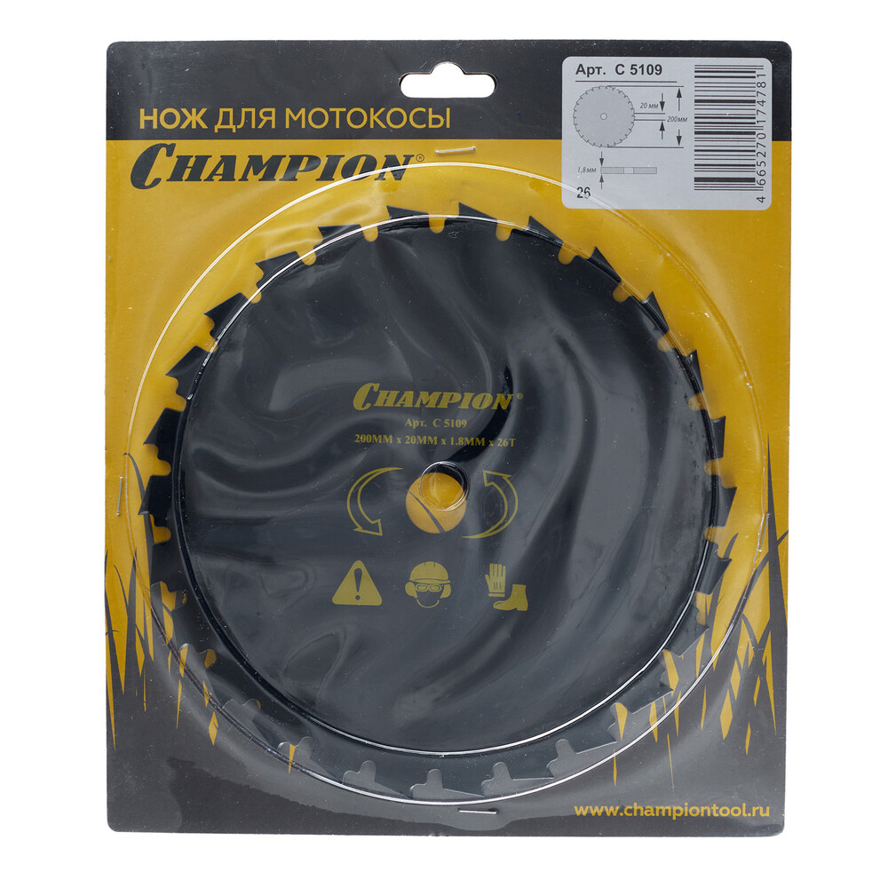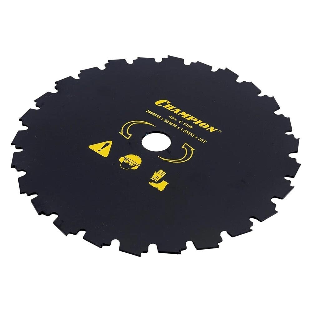 Нож с долотообразными зубцами Champion C5109 предназначен для триммеров с объемом двигателя от 45 см3 и используется для сучковатых кустарников, тонких стволов деревьев.