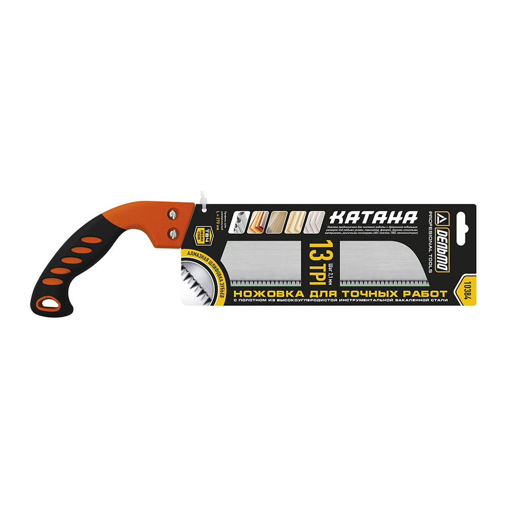 Предназначена для чистовой работы с древесиной небольших размеров под любыми углами, ламинатом, фанерой, другими слоистыми материалами, различными полимерами (АБС пластик, ПВХ, пенополистирол). Тонкое полотно изготовлено из высокоуглеродистой закаленной и полированной стали марки 65Г. Зубья выполнены алмазной шлифовкой и подвергнуты импульсной закалке ТВЧ, обеспечивающей высокую твердость и износостойкость. Эргономичная двухкомпонентная пистолетная рукоятка обеспечивает нескользящий захват, удобный угол резания и эффективное комфортное пиление.