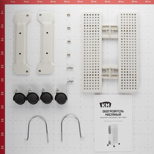 Масляный радиатор электрический в сборе – 1 шт., ножка опорная – 2 шт., гайка для крепления скобы – 2 шт., колесико – 4 шт., скоба – 2 шт., съемная сушилка для белья – 1 шт.