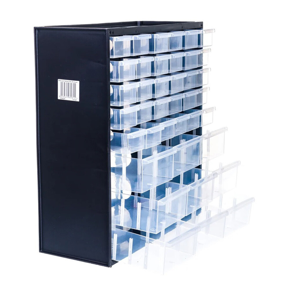 Предназначен для хранения и транспортировки инструмента, крепежных элементов и мелких деталей. Имеет 39 выдвижных секций. Изготовлен из высокопрочного пластика, съемные отделения прозрачные.